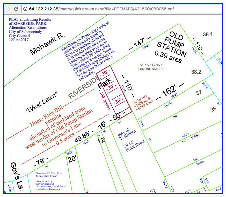 State Sen. James “Jim” Tedisco sponsored NYS Senate Bill 6692, which would grant the City of Schenectady, acting through its City Council, the home rule power to “alienate” 0.5 acres of Riverside Park for use as the location of a new sewage pumping station. As the Times Union’s Paul Nelson has explained, Sen. Tedisco wrote to the Mayor and City Council last Thursday offering to wait for a revised Bill that would alienate no more than the 30′ of land west of the current pump station fence. However, Mayor McCarthy’s principal assistant, David Fronk, wrote Friday morning that the City would not accept Tedisco’s offer. Moreover, Assemblyman Phil Steck let the City know late Friday that the Assembly was too close to the end of their session to allow a delay for rewriting the half-acre bill. Steck and Tedisco, however, have both stressed their hope that the new pump station could be kept within the lot of the current pump station, and would use no more than the discussed additional 30 feet. For Schenectady Gazette coverage of the parkland alienation compromise, click here (if you have a subscription).