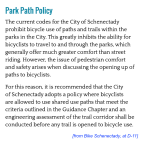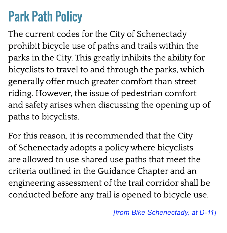 The draft Bike Schenectady Plan text speaks of “policy” changes to the Schenectady Municipal Code that would “open access to park pathways to bicyclists.” Thus, the Policy section states (App. D, at D-11; emphases added):