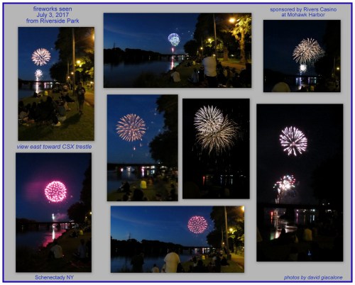 Nonetheless, a new tradition was apparently started on July 3 and 4, 2017, with fireworks displays sponsored by Rivers Casino at Mohawk Harbor. Folks came to Riverside Park in the Stockade to see the Rivers Casino fireworks, and by facing east, toward the CSX train trestle, they were able to enjoy a very good view of excellent fireworks [photo at right taken while waiting for the show to start on July 3]. I was not able to be in the audience for the big show on July 4th, but did see the July 3 “teaser”, and had a good time.