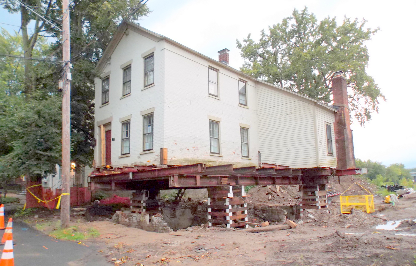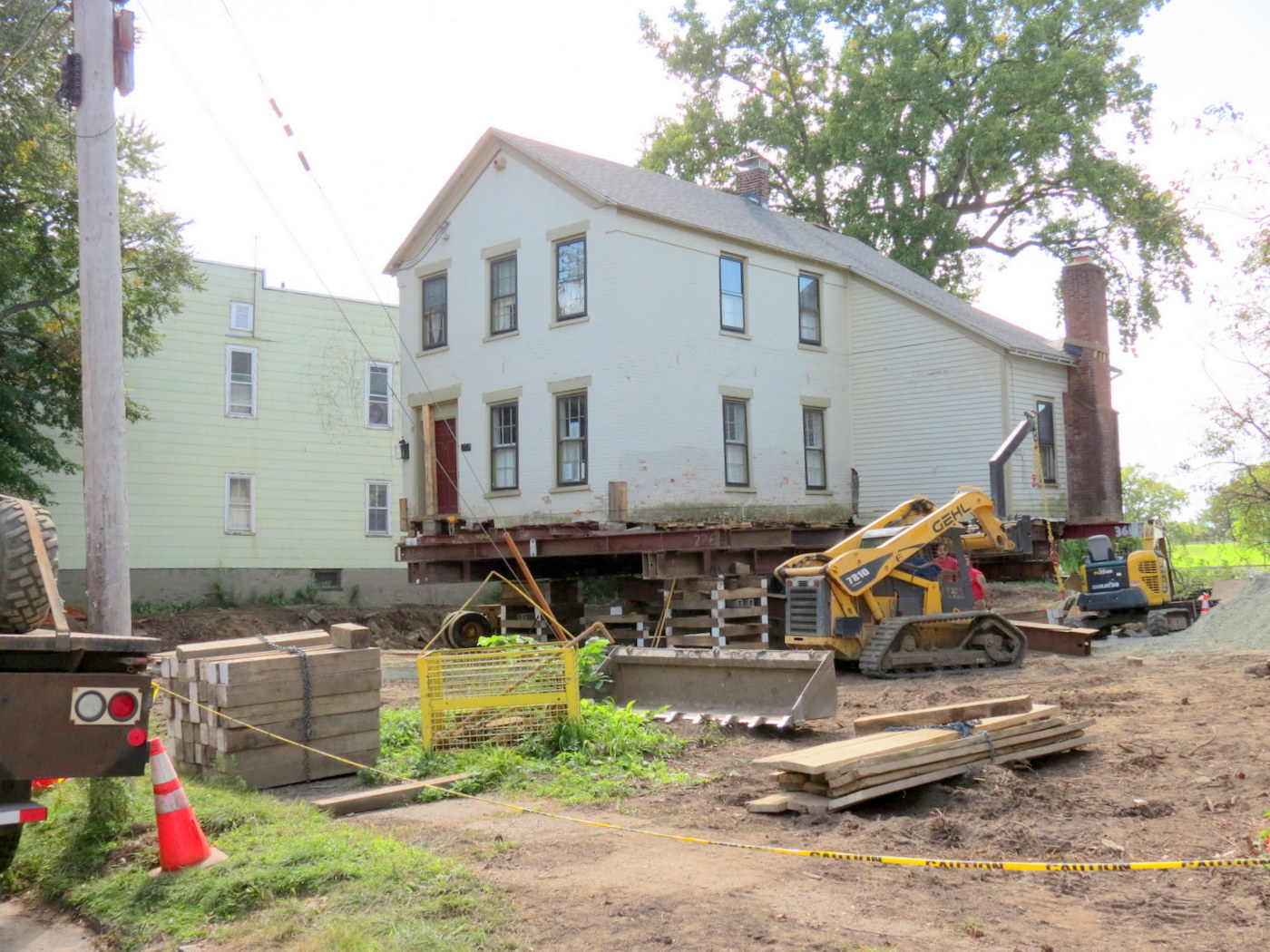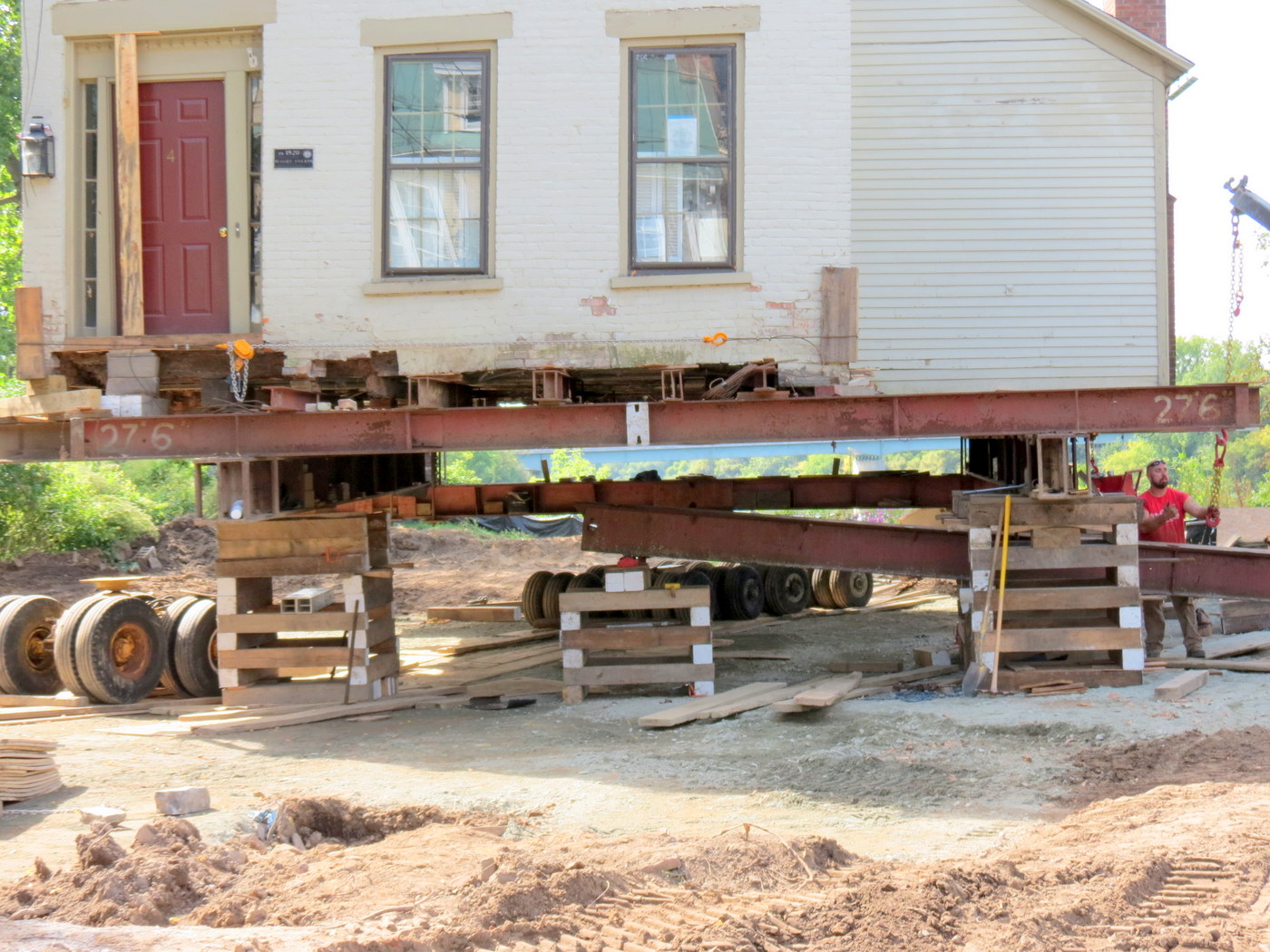 update (September 7, 2017): I learned this morning from James Plowman, the general contractor for the project, that they have decided to move the house directly to its final location (15 feet back from the street and 20′ farther from the River), rather than risk more jostling of the old structure by moving first to a temporary location while the new foundation is being constructed. They will be bringing in dirt for fill and then the big wheels on dollies for the move, with Monday, September 11, 2017, now seeming like the likely day for the move.