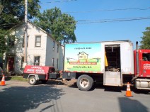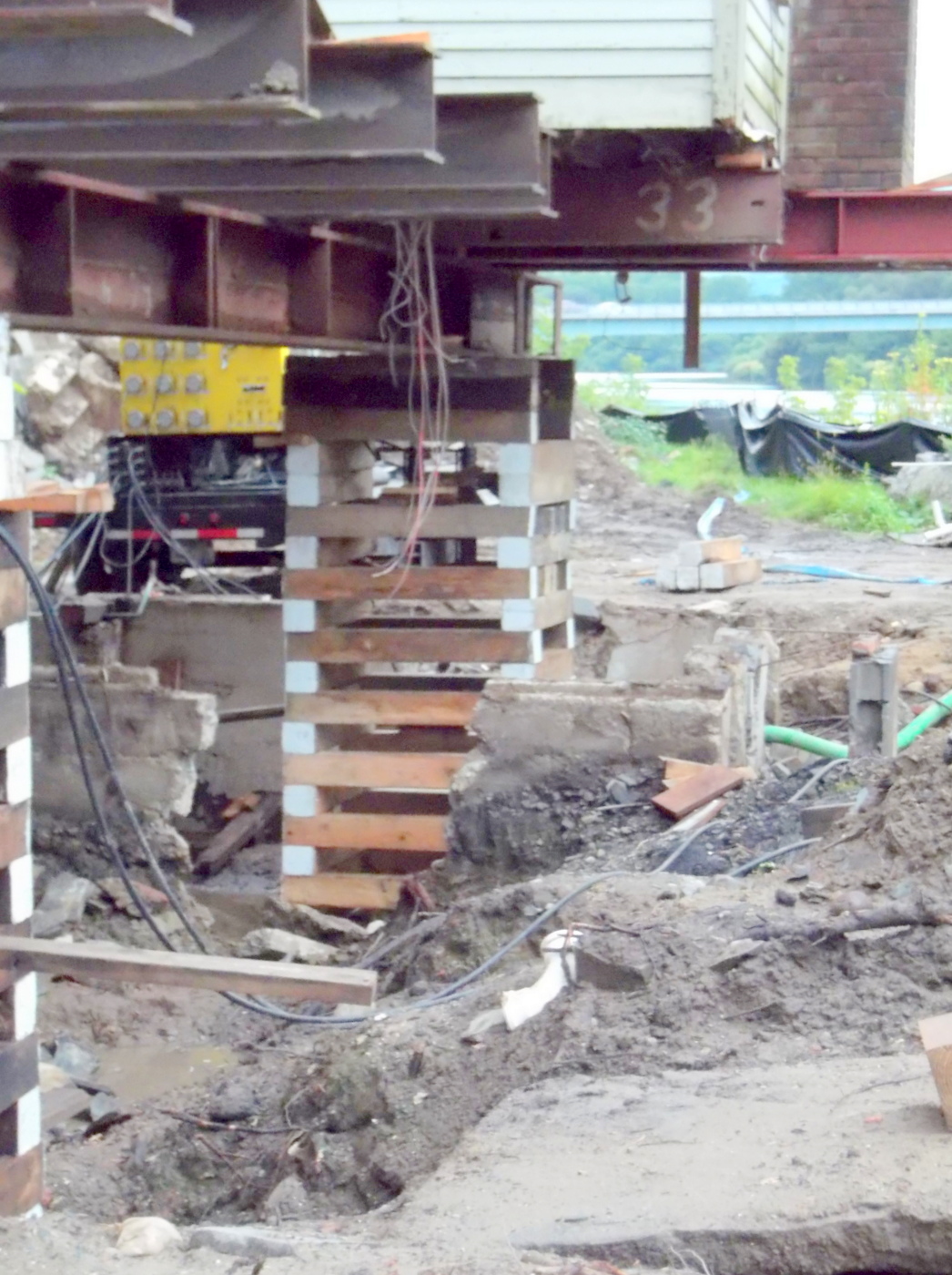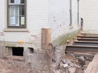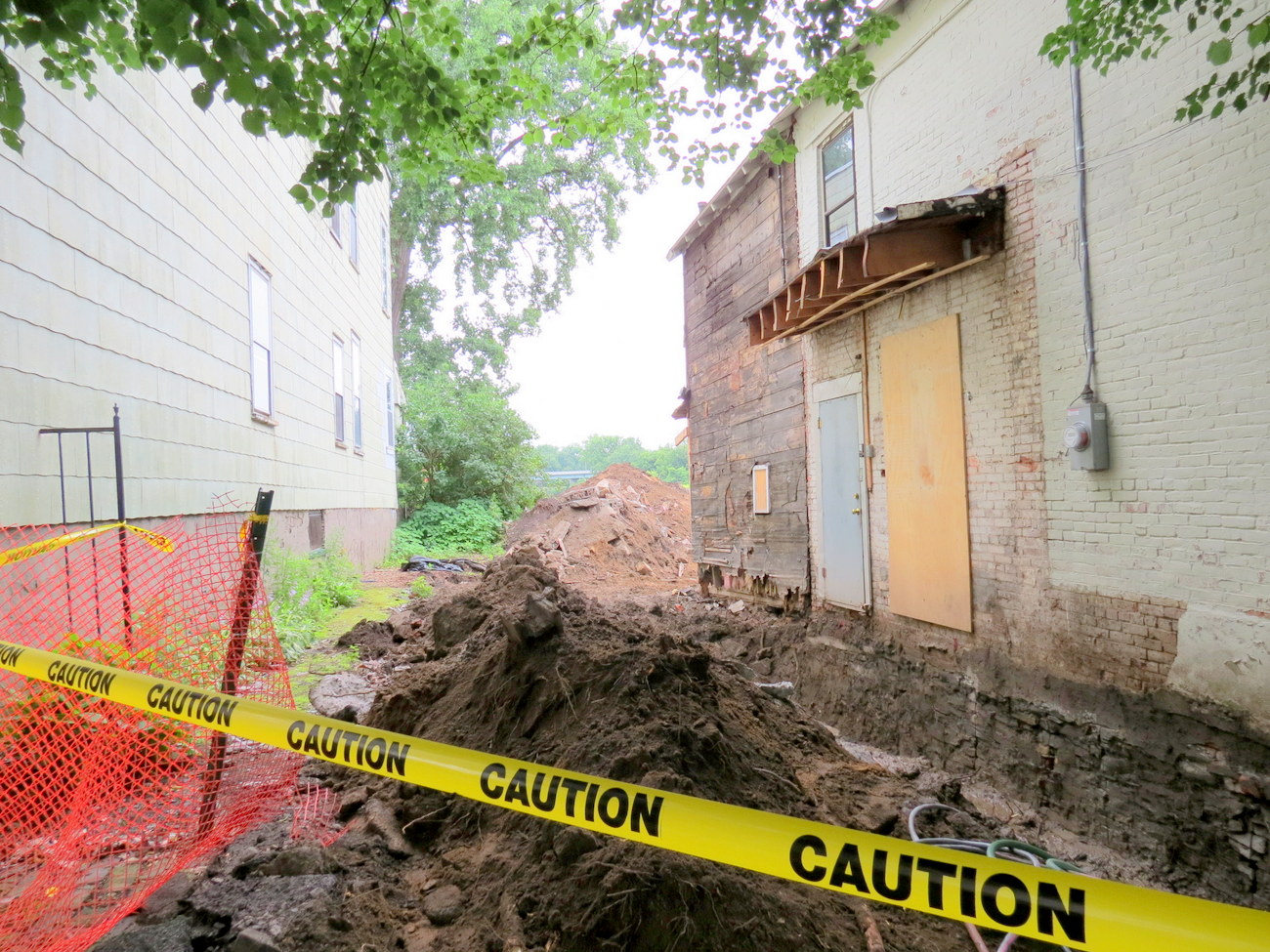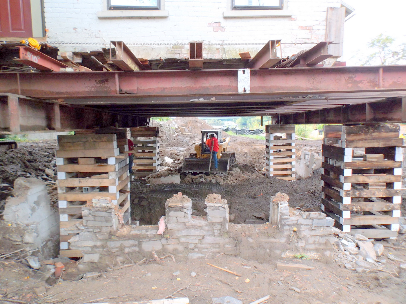 update (September 7, 2017): I learned this morning from James Plowman, the general contractor for the project, that they have decided to move the house directly to its final location (15 feet back from the street and 20′ farther from the River), rather than risk more jostling of the old structure by moving first to a temporary location while the new foundation is being constructed. They will be bringing in dirt for fill and then the big wheels on dollies for the move, with Monday, September 11, 2017, now seeming like the likely day for the move.