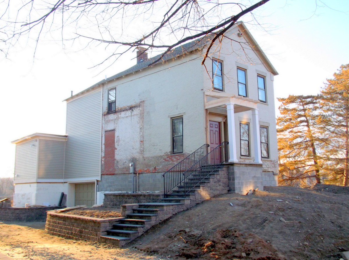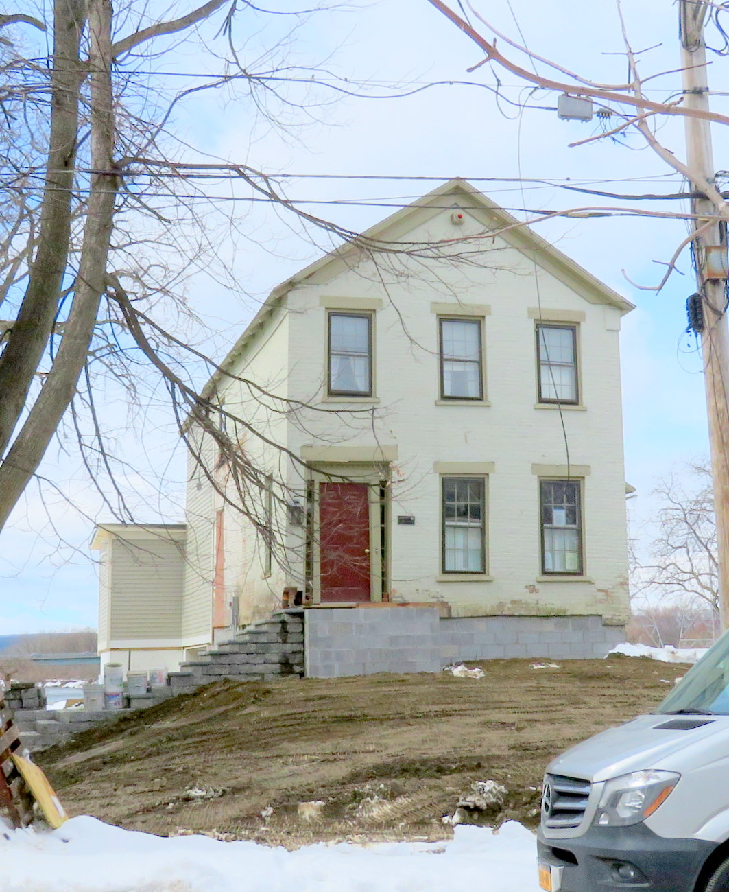 flood-ready (January 2018): The landscaping was not completed before the winter freeze, but 4 Washington Avenue was safely above the flood-plain, as seen in the above photo display, taken a few days before our January 13-14 ice jam and flooding, as we reported in depth.