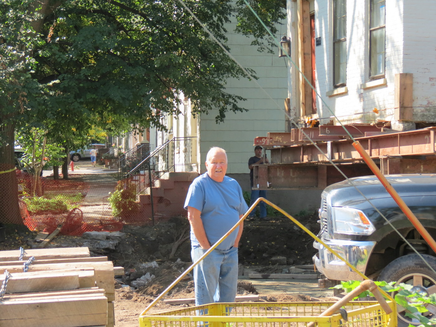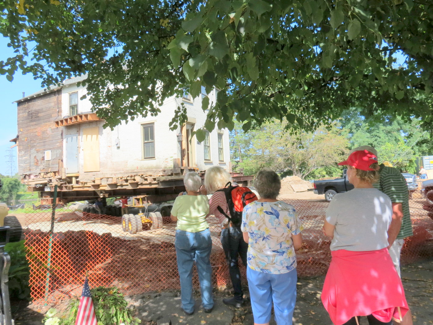 . . above: 4 Washington Ave. has moved to its final destination; [L] Contractor James Plowman at start of today’s move; [R] onlookers view house at final location (11:30 AM, Sept. 13, 2017); below (3PM): northeast view of house [L]; wheeled jacks removed, cribs in place:
