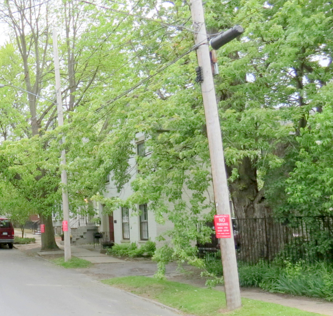We have had a lot or rain lately, and many sidewalk kibitzers and amateur engineers have offered me and other neighbors skeptical predictions about the likelihood that the ancient structure, with its flagstone and brick foundation, can be successfully and safely moved. Like virtually all Stockade homes, the original home has had additions appended to it. Whether it is out of an abundance of caution or true necessity, yesterday (Friday, July 28, 2017), workers strung a metal cable and chain around the structure. See the photo to the right of this paragraph.- As always, you can see a larger version of an image in the Slideshow by pausing it on the image, right-clicking and choosing See Image in New Tab.