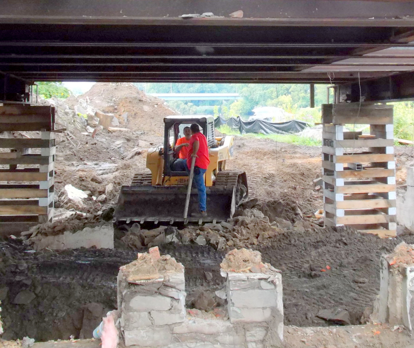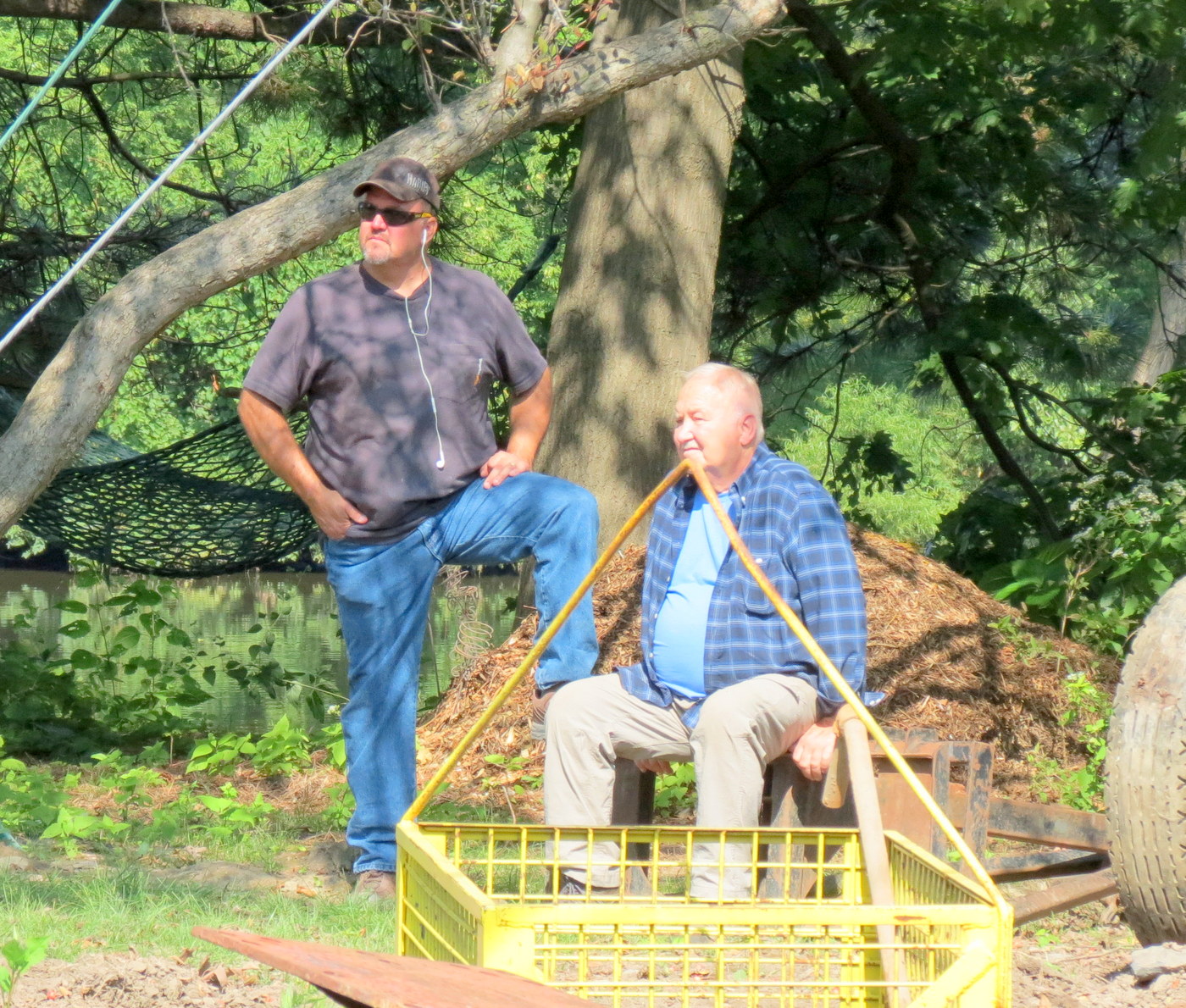 . . above: Garret (standing) and Jim Plowman watch Lorman crew securing girders under the elevated house to prepare for the big move (Sept. 11, 2017)