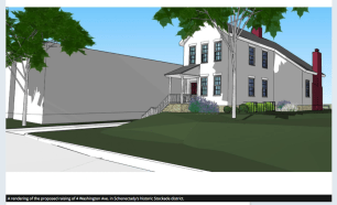 In response, Meredith has asked the Schenectady Historic District Committee for permission to raise and move the house to another location on its lot. If the current project is successful, sometime this summer (2017), the house will be elevated about 12.0 feet and set back 15 to 20 feet from Washington Avenue, in order to remove it from the River’s flood plain. See “Stockade project to move historic home from flood plain underway” (Albany Times Union, by Paul Nelson, July 20, 2017). It took the homeowner, her architect (and across-the-street neighbor) Frank Gilmore, and contractor Jim Plowman, several sessions before Schenectady’s Historic District Commission approved the lift-and-move project, which is the first such project in the Stockade Historic District, where paint colors and removal of window shutters need Commission permission. See “Panel OKs plan to elevate Schenectady home above flood zone” (Times Union, by Paul Nelson, November 17, 2015); and “Homeowner allowed to raise, move Stockade house: After nearly half a year of discussion, the Schenectady Historic District Commission reluctantly agrees” (Schenectady Daily Gazette, by Haley Viccaro, November 16, 2015; $ub. req’d). The sketch to the right of this paragraph is the rendering submitted to the Historic Commission when seeking its approval for the project.