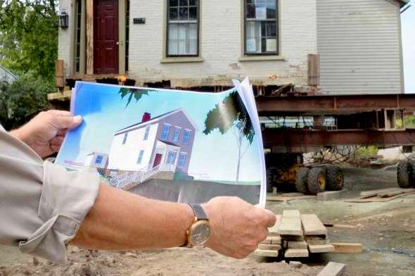 [T]he structure will remain at a temporary site for upwards of a month, which will give the crew time to fill in and shore up the foundation at the new spot, said [contractor Jim] Plowman. A one-car garage will be built into the foundation.