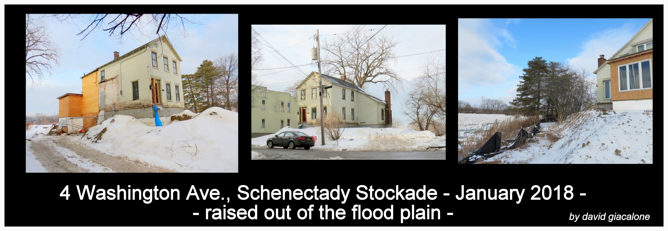 update (Aug. 10, 2018): The Times Union reported online last night that “the work to move, elevate and fix up [4 Washington Avenue in the Stockade] is all but done.” “Stockade house move nears completion as pump station project in limbo” (by Paul Nelson, August 9, 2018). Owner Meredith Anker is quoted saying, “The inside is the same structure but because it’s elevated the sun comes in and it’s unbelievable.” Moreover,