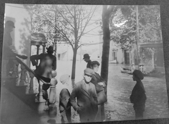 . . left: floodwaters at end of Washington Ave., with neighbors at stoop of 6 Washington Ave. (vintage photo from collection of Schenectady County Historical Society, undated)