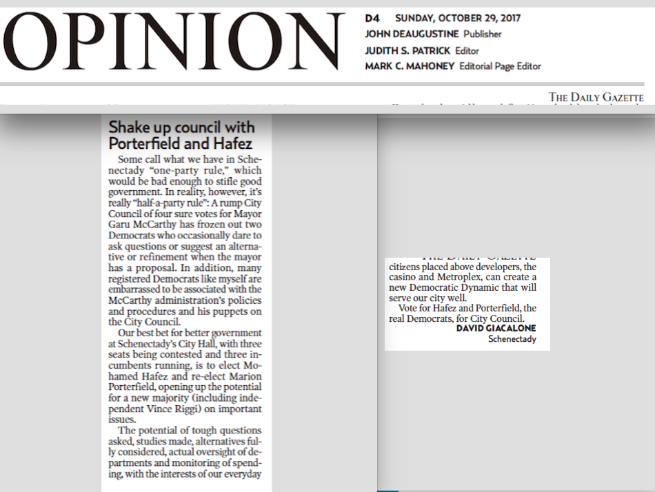 FYI follow-up (October 29, 2017): Here’s my Letter to the Editor in today’s Sunday Gazette to encourage voting for the “real Democrats”, Hafez and Porterfield: