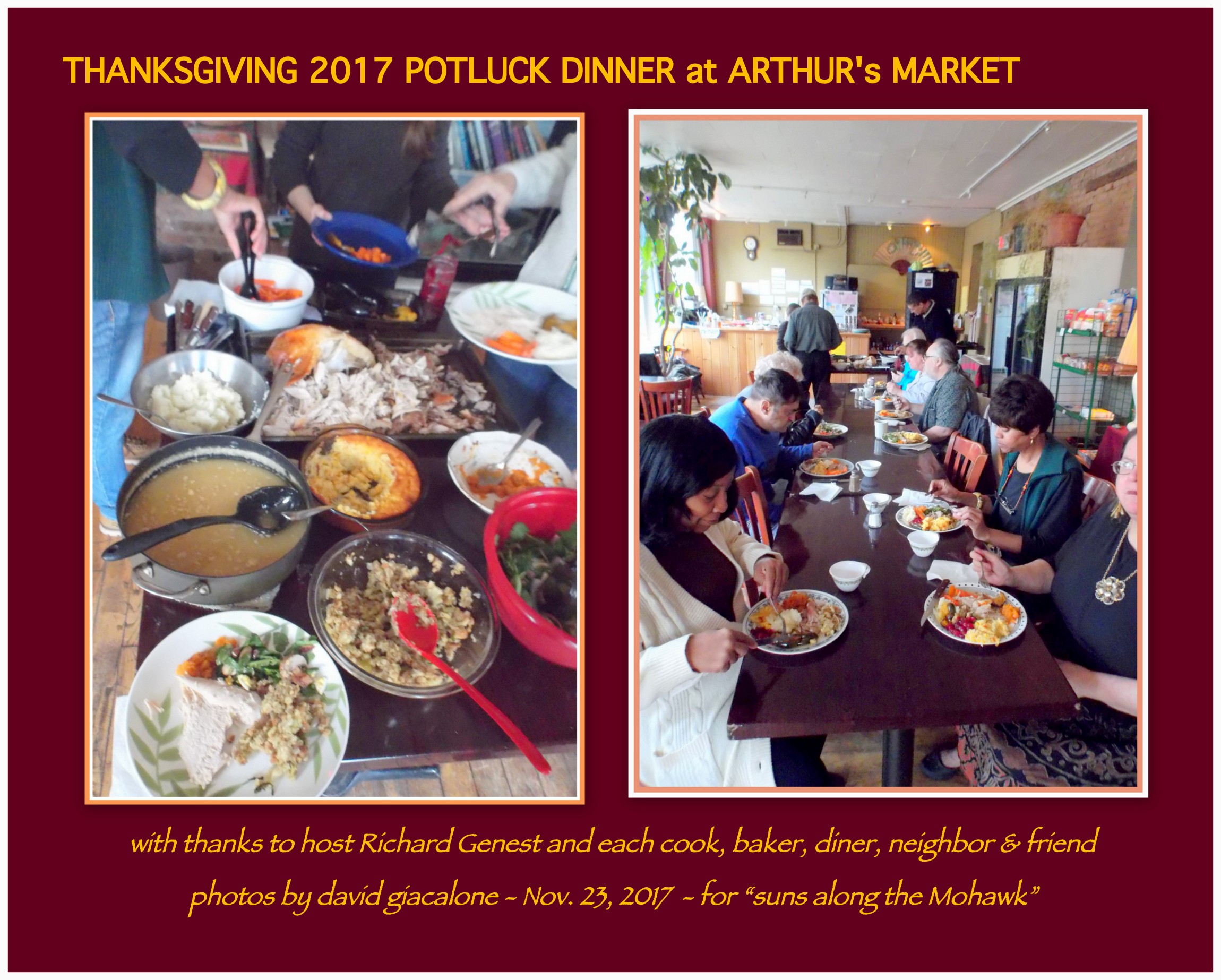 I hope all my Stockade neighbors and friends had a Thanksgiving meal as tasty, heartwarming, and enjoyable as the potluck dinner I enjoyed with a dozen others at Arthur’s Market yesterday. Not wanting to intrude with my camera, I took only a few quick photos. The above collage shows the buffet table and the main dining table. Not shown, but definitely not ignored by the guests, were five fine pies and some cute cupcakes that ended the meal with a gentle exclamation point.