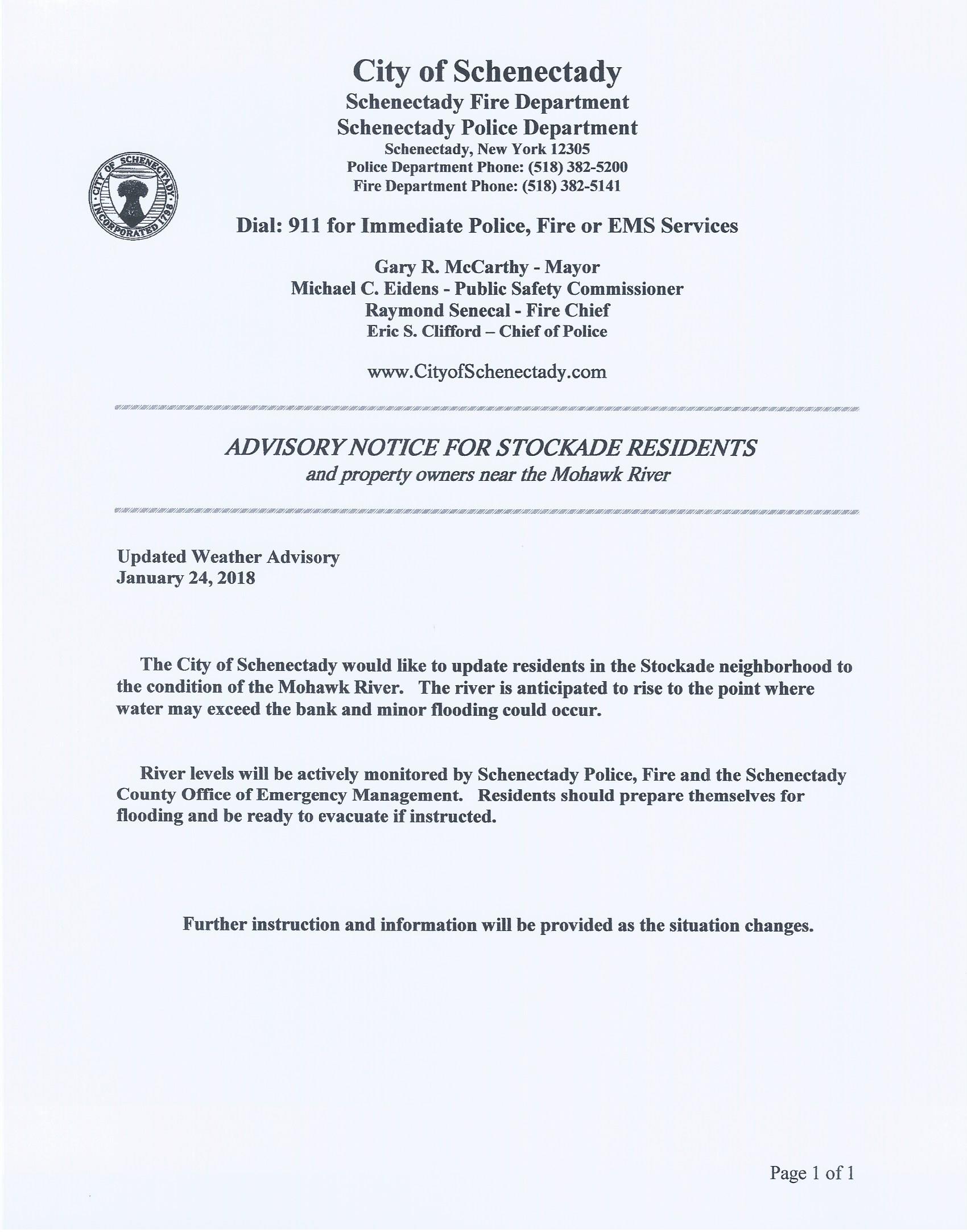 Wed. Evening ALERT: The City of Schenectady issued an Updated Weather Advisory for Stockaders on Wednesday afternoon, Jan. 24. Click on the image to the right. And see Gazette coverage, here. .