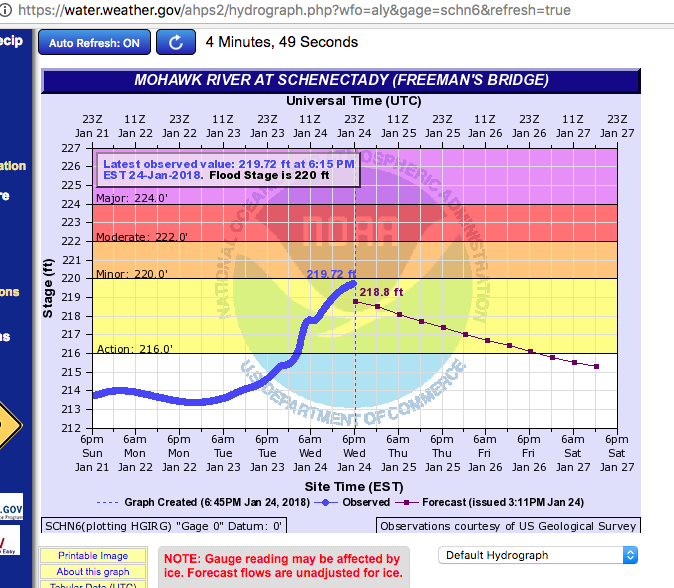 Thursday (Jan. 25, 7 AM) Update: The Mohawk has been going down slowly all night and is projected to continue to fall. Click here for the NWS Hydrograph. At 6 AM the level was 219.43, with 220.0 as the flood level. FYI: See “Cuomo says special teams are assessing ice jams across upstate” (Times Union, Rick Karlin, Jan. 25, 2018)