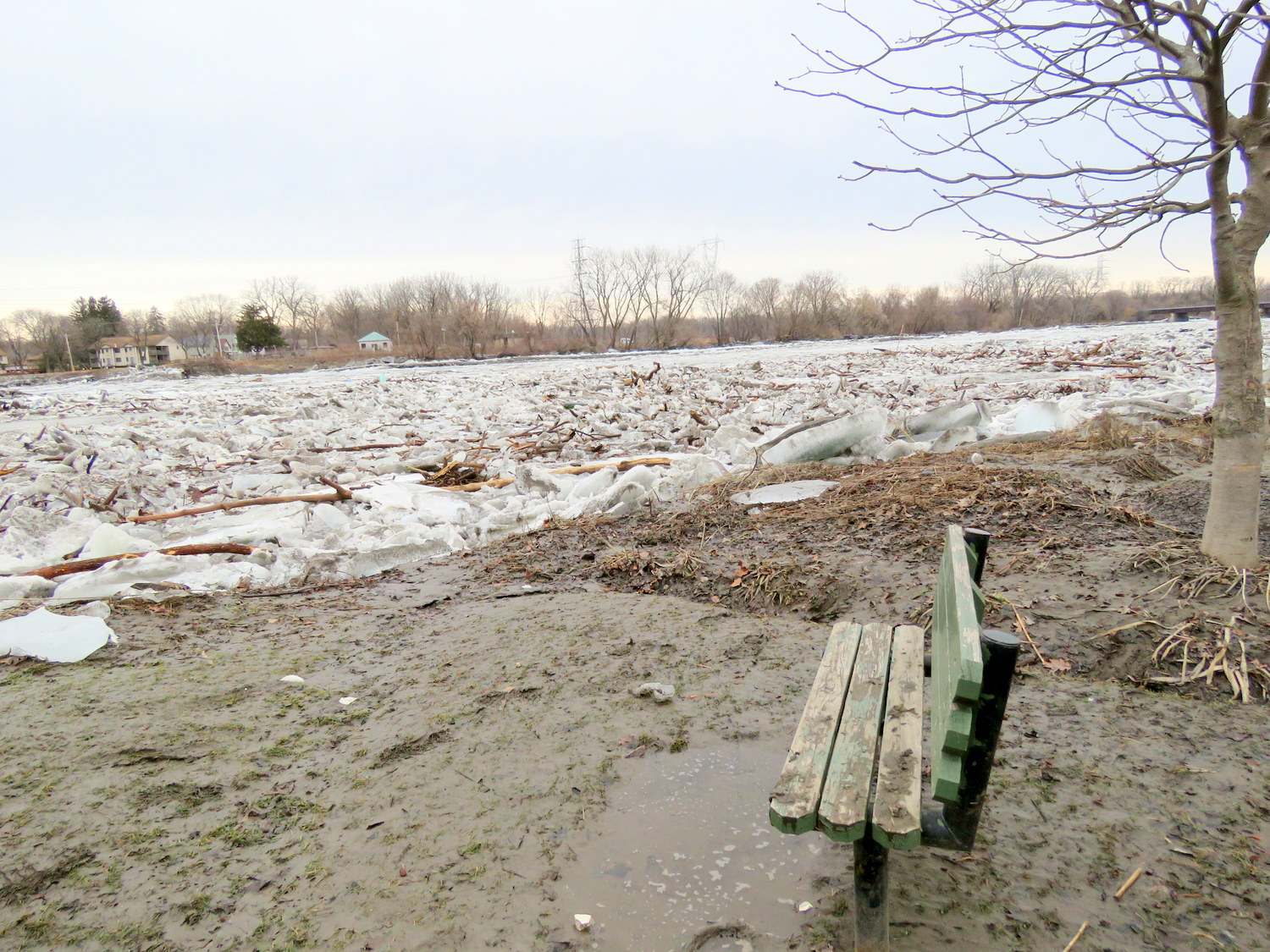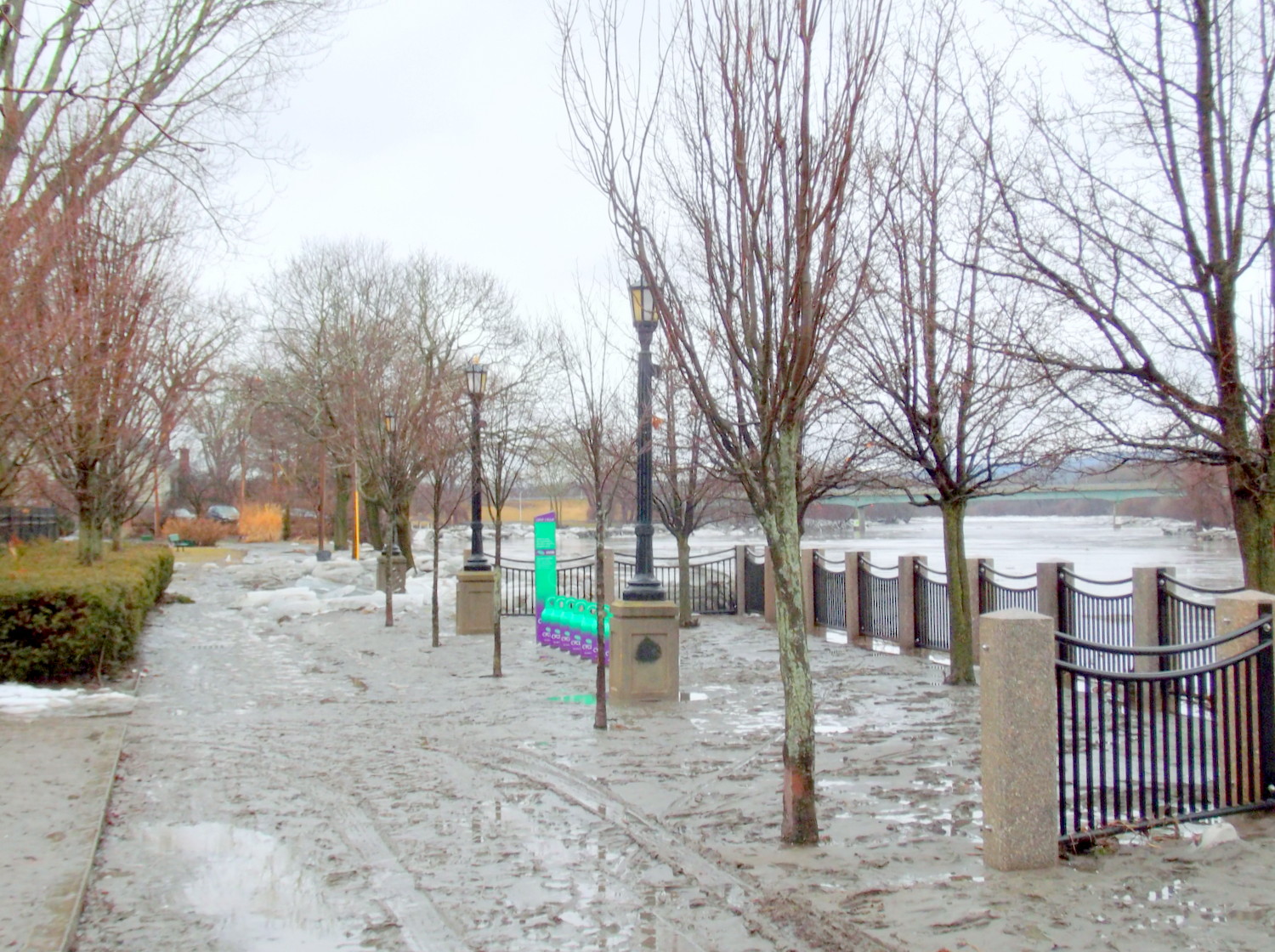 update (Sunday, Feb. 25): My visit before noon to the Mohawk riverbank along the Schenectady Stockade revealed that the River channel south of the Isle of the Cayugas and entire River east of Scotia’s Burr Bridge embankment was clear, with occasional small chunks of ice moving rapidly by. [see image above on Right; click for a larger version] Two other observations: First, the channel along the south/Scotia side of the Isle of the Cayugas is still clogged with ice cover and floes, basically up to the east tip of the Isle. Second, the Esplanade (like virtually all of the Park) is a muddy mess. See the next two images. And, see the Sunday Slideshow at the bottom of this posting.