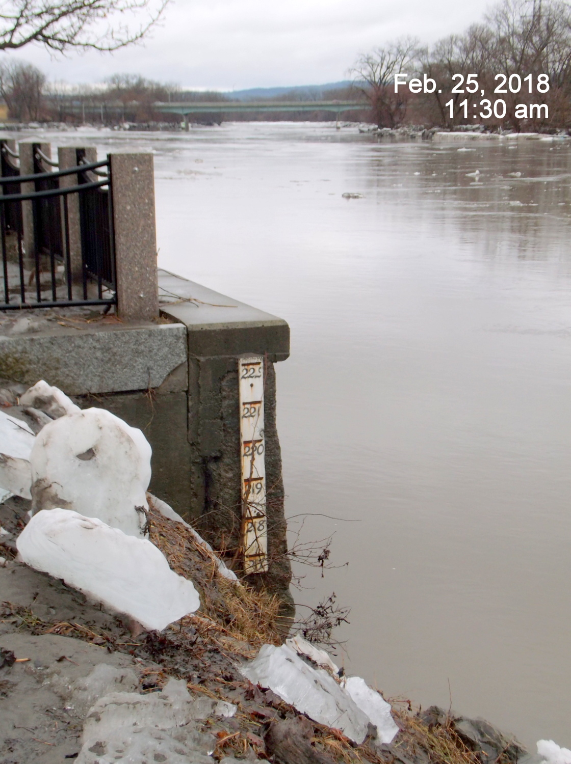 According to the NWS Hydrograph, the water level observation at 4:40 PM today at Freeman’s Bridge was 213.71ft, and the latest prediction has the level stay below 214 ft. for the next two days.- If, as of Sunday February 25, you want to see closeup large ice floes along the Stockade riverbank, you should head to the river end of Cucumber Alley. Don’t let the Stop Sign fool you, Cucumber Alley still a roadway that goes all the way to the River and is open to the public.