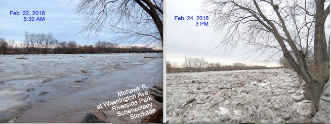 A shifting mass of ice and floes (and debris), along the Schenectady Stockade portion of the Mohawk River today (Saturday), was a good reminder that people in the flood-prone part of the Stockade, and the City’s emergency response team, need to be prepared and vigilant. The flow of the River has been quite powerful, but that is a mixed blessing if the ice cover breaks up and forms an ice dam; and, the force of the current itself can make such breaking of the ice cover more likely.