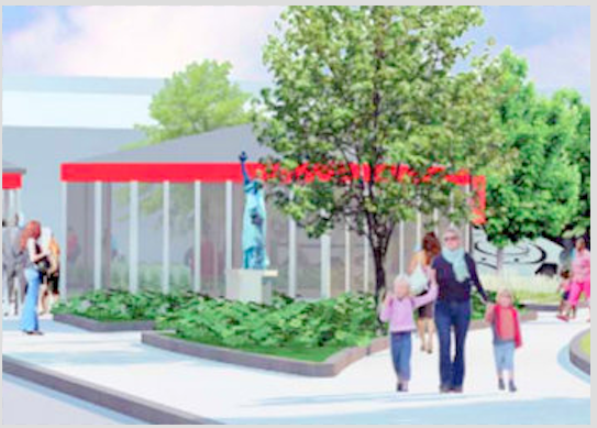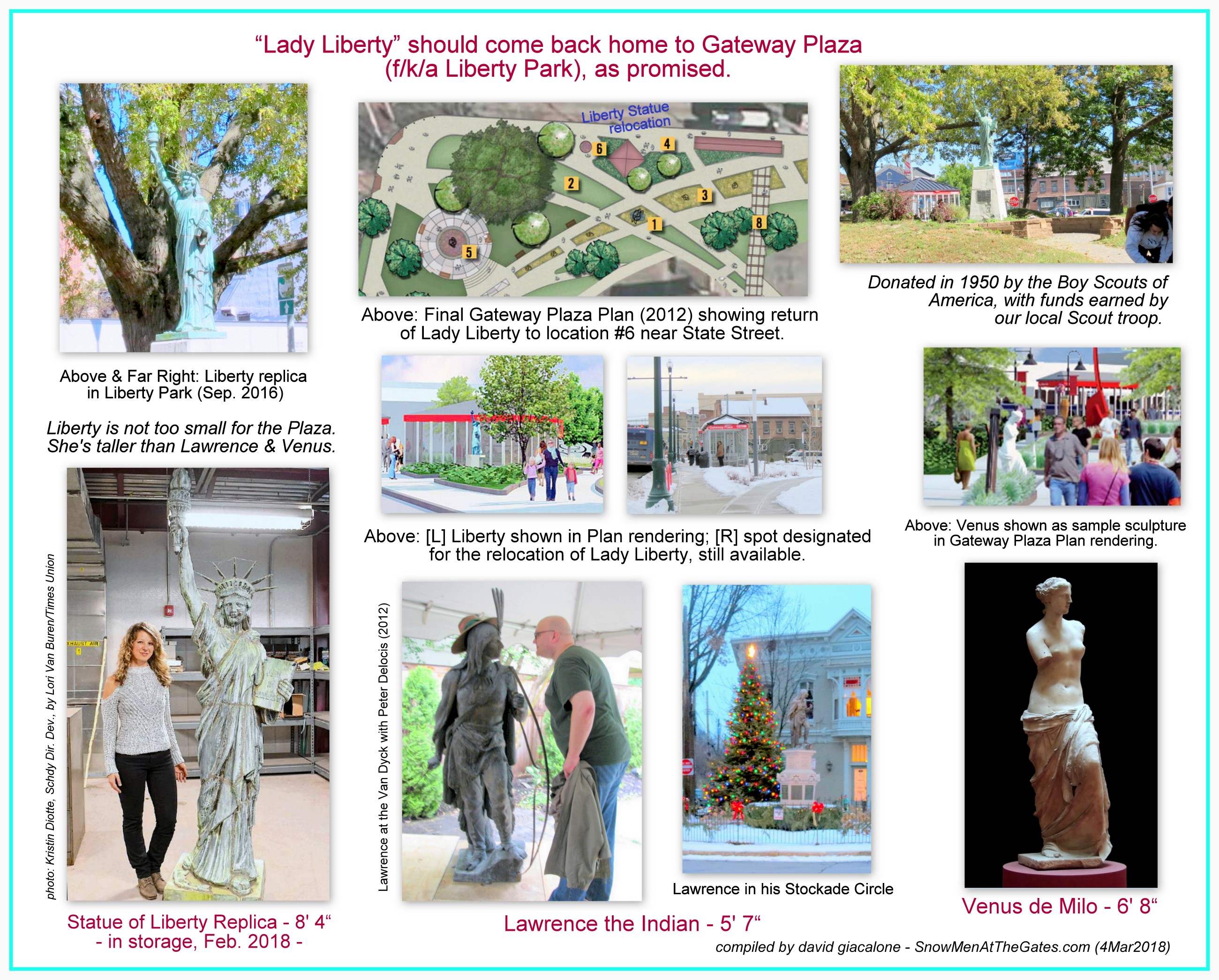 Editorial follow-up (May 26, 2019): Fifteen months after first asking Mayor McCarthy and City Council why Schenectady’s Lady Liberty Replica statue is not back in Her park, as required in the approved Final Implementation Plan for Gateway Plaza, Lady Liberty is still locked up in a City storage room, and we are told she was damaged in storage. We have been given no description of the damage or estimates for its repair. And, we have been given no promise that She will be returned to Her home from 1950 to 2017. [on right, detail from a Final Plan rendering, showing her return]