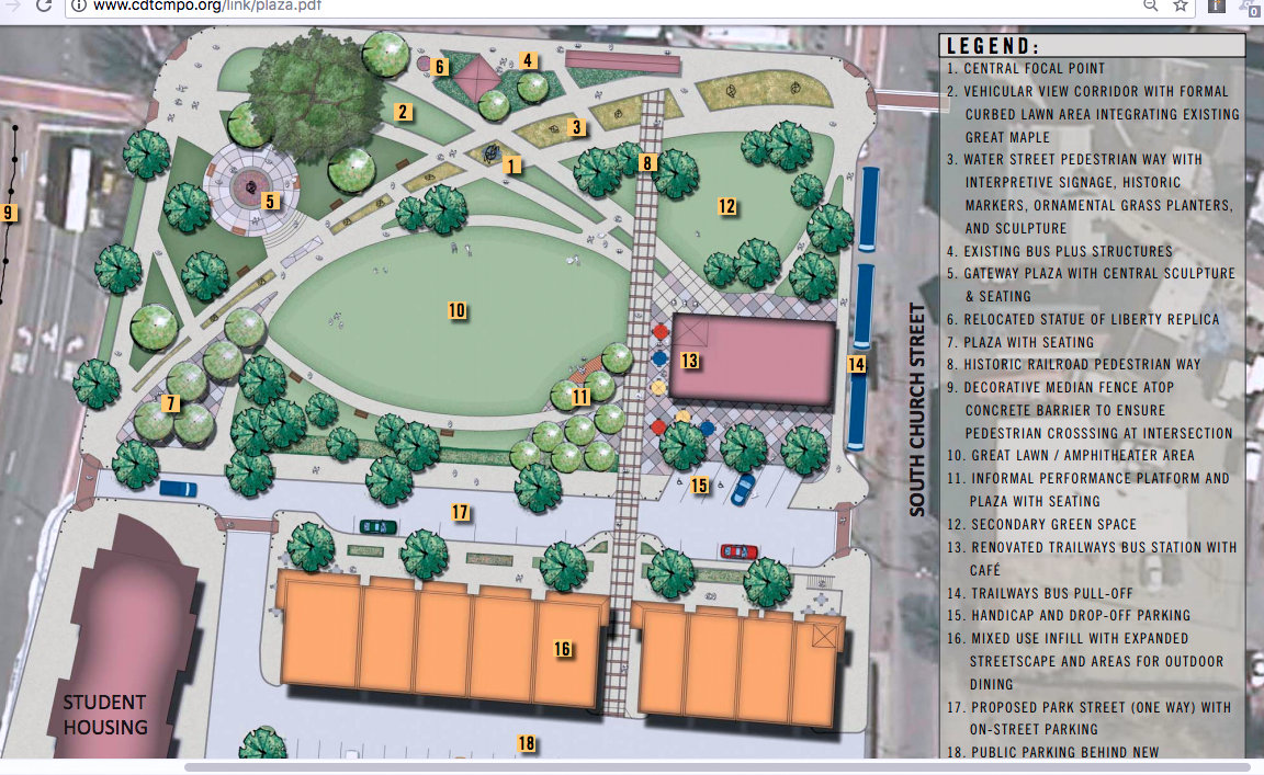 Editor’s Note: There is one issue I must raise, and will soon say more. It has recently been announced that the replica of the Statue of Liberty erected in Liberty Park in November 1950, donated by a local Boy Scout troop, will not be returned to the new Plaza, but will be getting a new foster home elsewhere in Schenectady. As you can see in the Legend in the above Plan drawing (item #6) and in the detail to the left from a rendering in the Final Plan, the original, announced, natural, and very popular plan was to bring Liberty back to Her Home. We should insist that this piece of the Park’s history, and our history, be given a new place of honor in her Park. Click the following link for an “advocacy collage” arguing that we must Bring Lady Liberty Home, and particularly that (despite current excuses) she is not too small to make an adequate impact at the new Plaza.