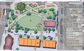 . . as a Gateway Park, the space must cater heavily to both the pedestrian and the vehicular user. Another driving factor is the crucial role the park needs to play in providing connectivity between SCCC, the new student housing, Downtown Schenectady, and the historic Stockade Neighborhood. The new design for the park is therefore organized around two strong cross-axes that share a central focal point and organize the park into a series of rooms and spaces that cater to a diversity of uses.