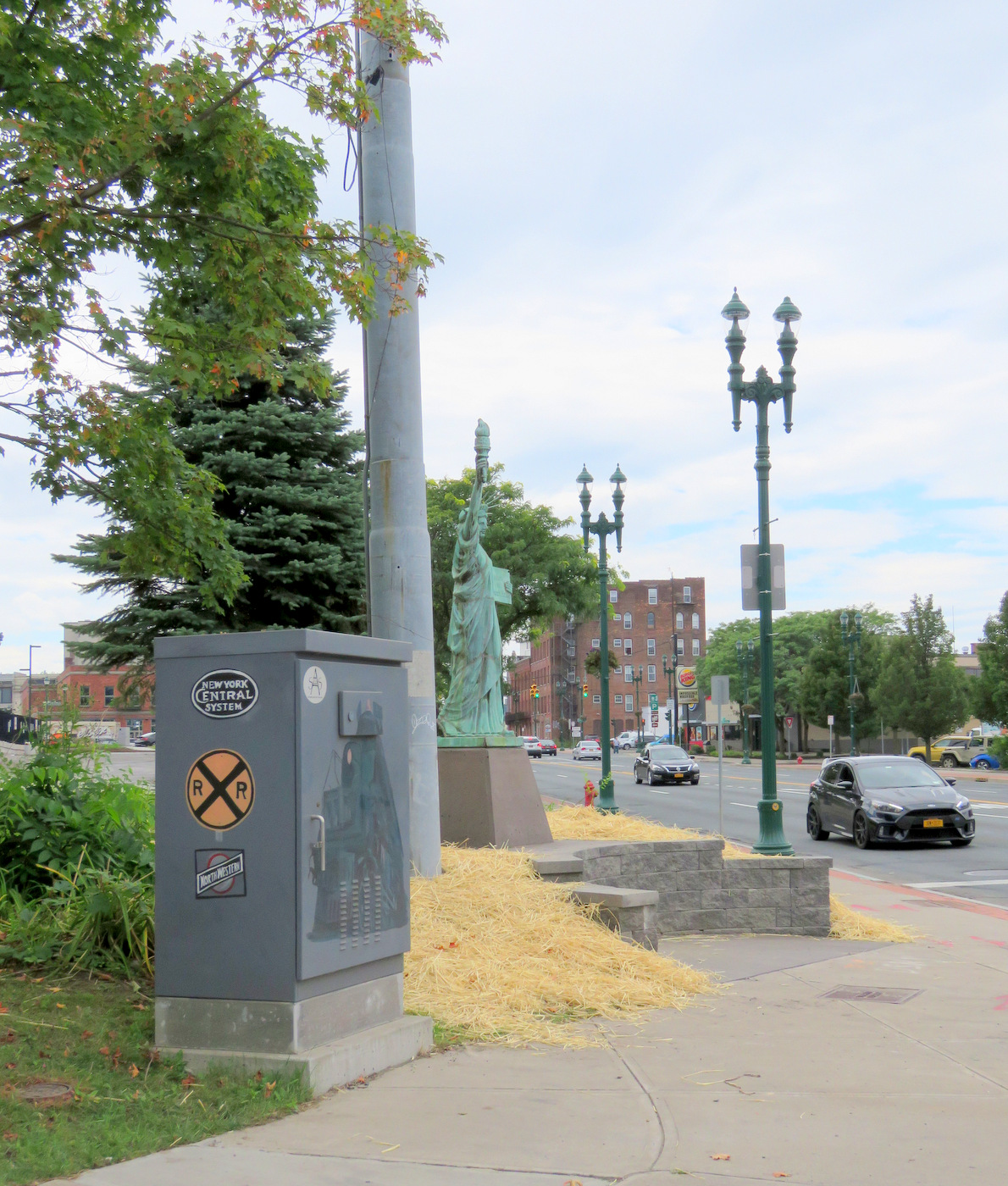 follow-up: Still no explanation for her exile after 18 months, but Lady Liberty has been given an utterly inappropriate new home at Erie Blvd. and Union Street, at the RR underpass. See “McCarthy disses Lady Liberty (and all of us) again“, Aug. 28, 2019.]