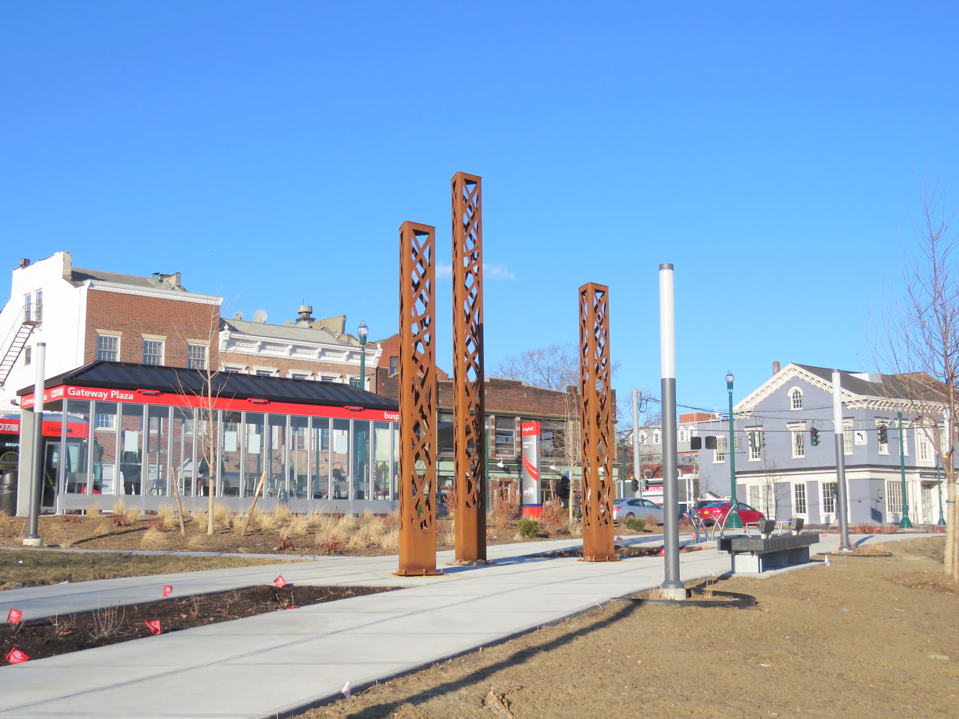 . CDTA bus shelter, sculpture pillars, modern light-poles