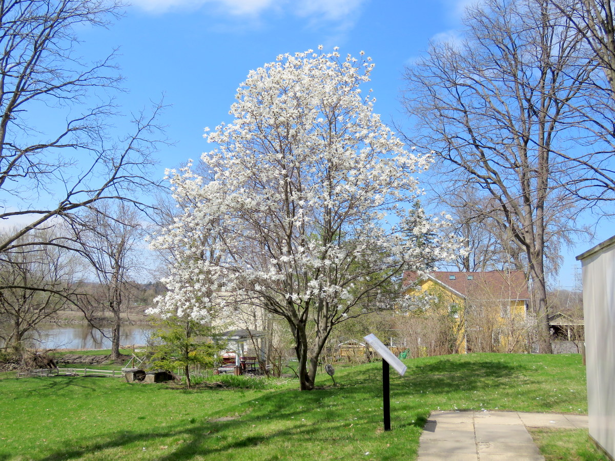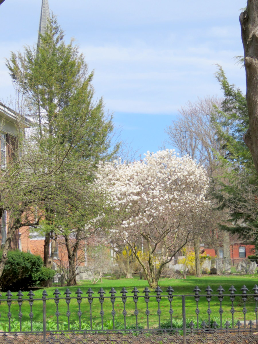 . . above: white magnolia trees in bloom at [L] St. George’s south lawn; and [R] Schenectady County Historical Society . .