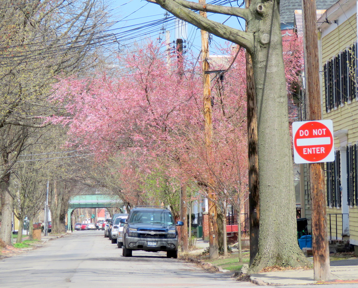 above: cherry blossoms [L] on Front Street south of Lawrence and [R] at Union St. and Washington Ave.