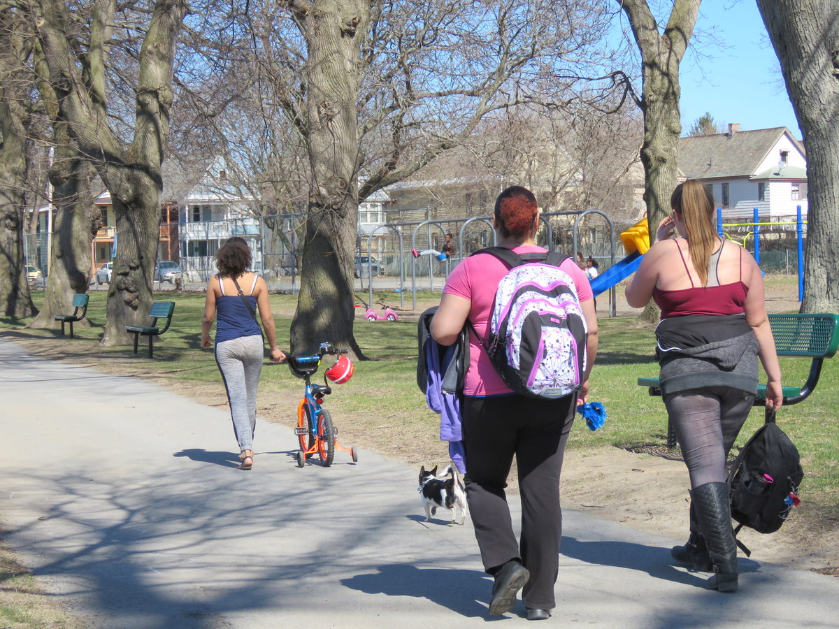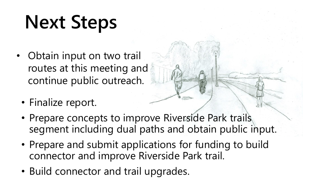 2. IMG_6724 STUDY ASSUMPTION: Riverside Park is already Part of the Bike-Trail System. The question addressed in the Study is how to link with it. However, to the relief of many at the Meeting who demurred at deciding how to link to the Park without first deciding whether the Park walkway would be converted to a bike trail, the Study does provide that there must be an additional planning stage in which necessary “improvements” are considered at Riverside Park, especially to its existing “walkway”. An example of a possible improvement/reconfiguration of Riverside Park is to create a separate pedestrian path to meet many concerns expressed about a trail’s impact on the Park’s current users. [editor’s note: For explanations of our concerns, see our discussion at http://tinyurl.com/RiversideBikes2 ]