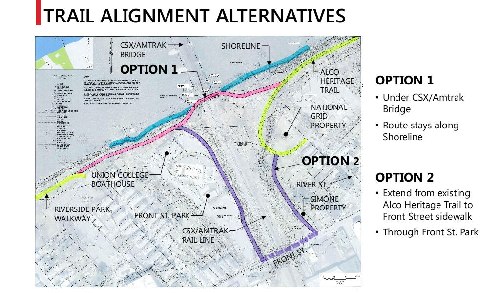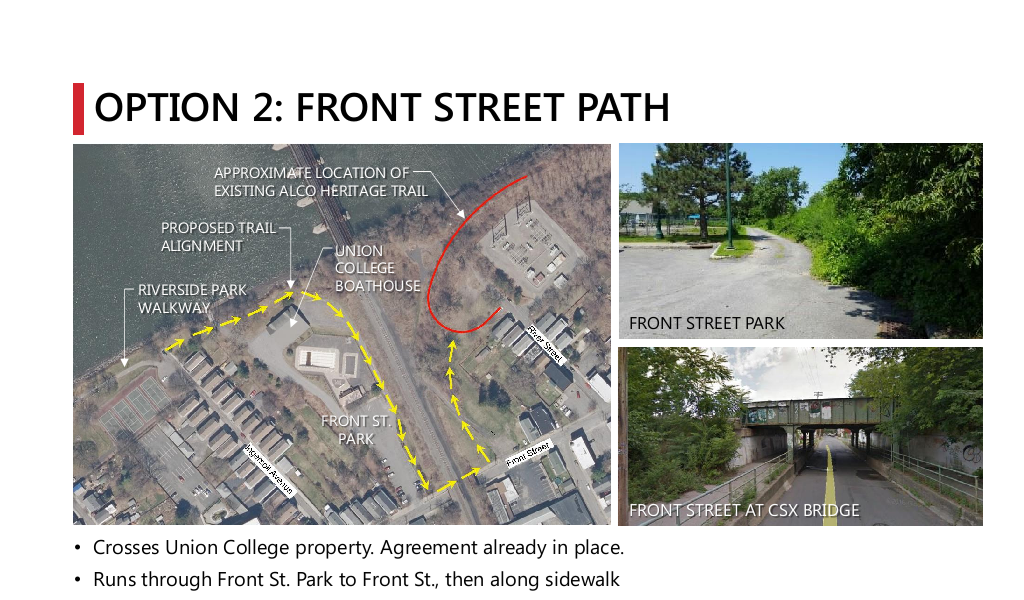 2. OPTION 2: Front Street Path: It would start at the “Riverside Park Walkway”, cross Union College property (with an Agreement already in place), run through Front St. Park, then along a sidewalk on Front St. and through either CSX railroad or vacant property to the existing ALCO Heritage Trail.
