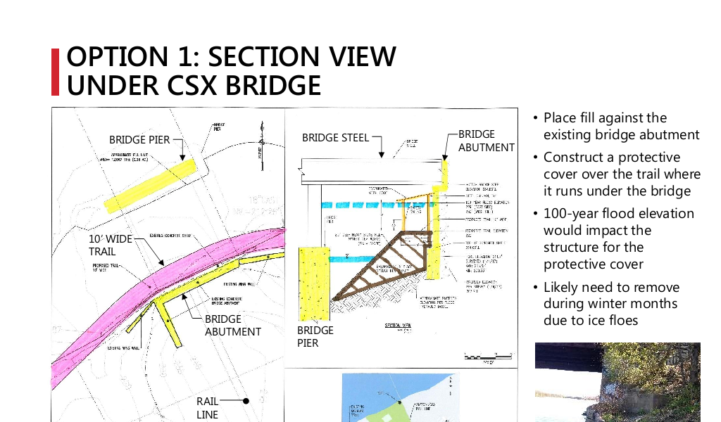 1. OPTION 1: Under the CSX Bridge:  Trail would run under the existing CSX/Amtrak Bridge, with two alternative alighnments (a steeper one with an 11% slope and one with an 8% slope). It would require placing fill against the existing bridge abutmenmt, out to the first pier; constructing a protective cover over the trail where it runs under the bridge; removal is likely to be needed during winter months due to ice floes.