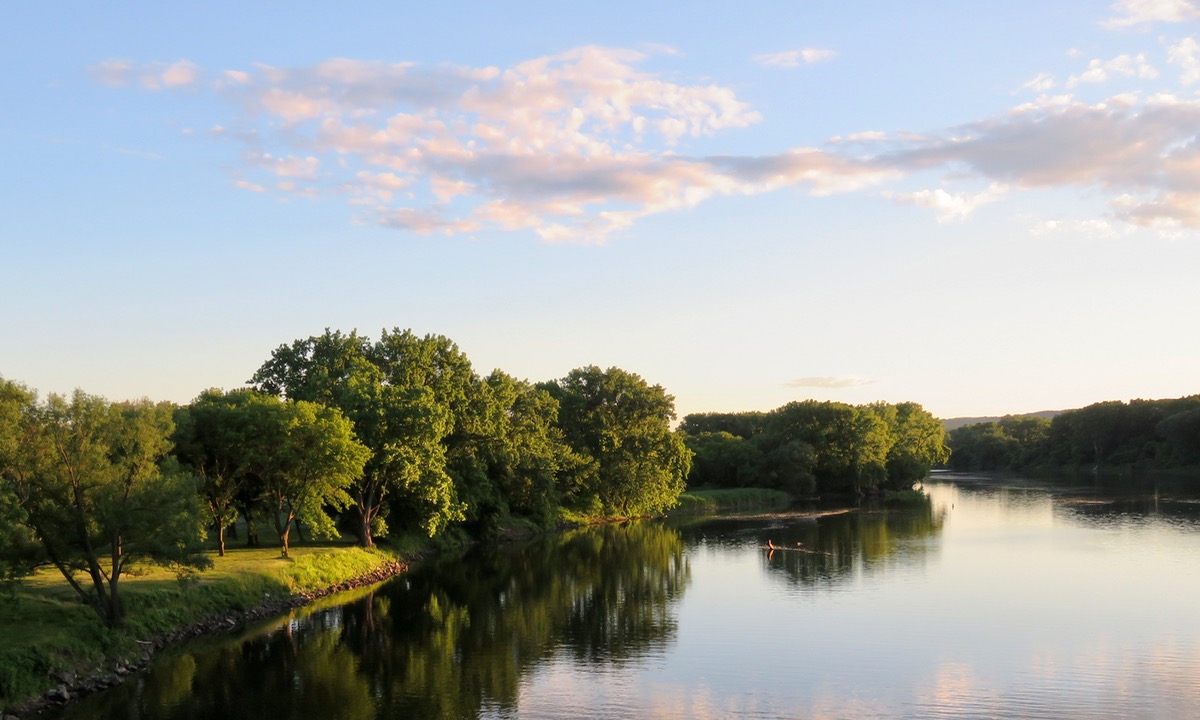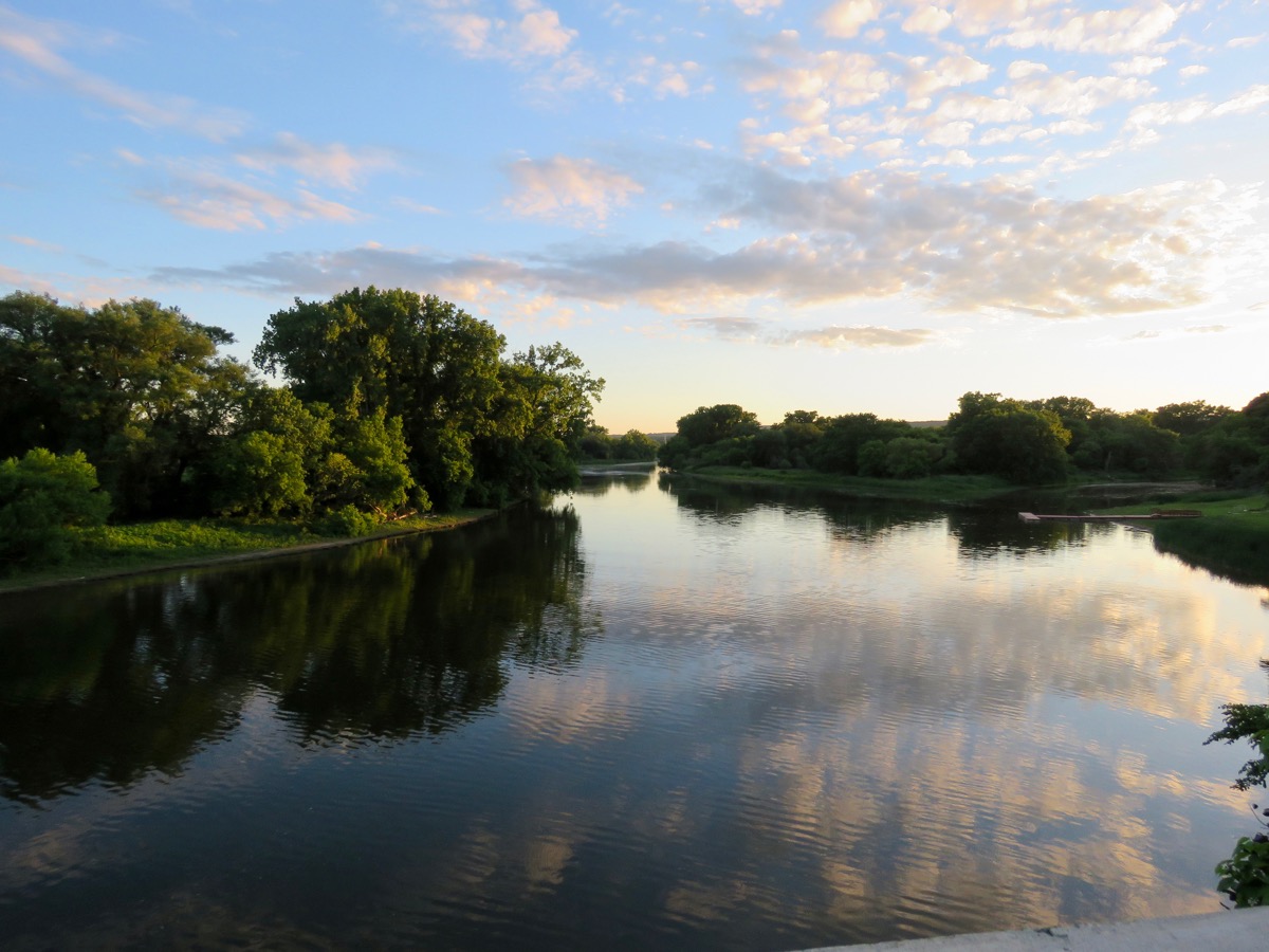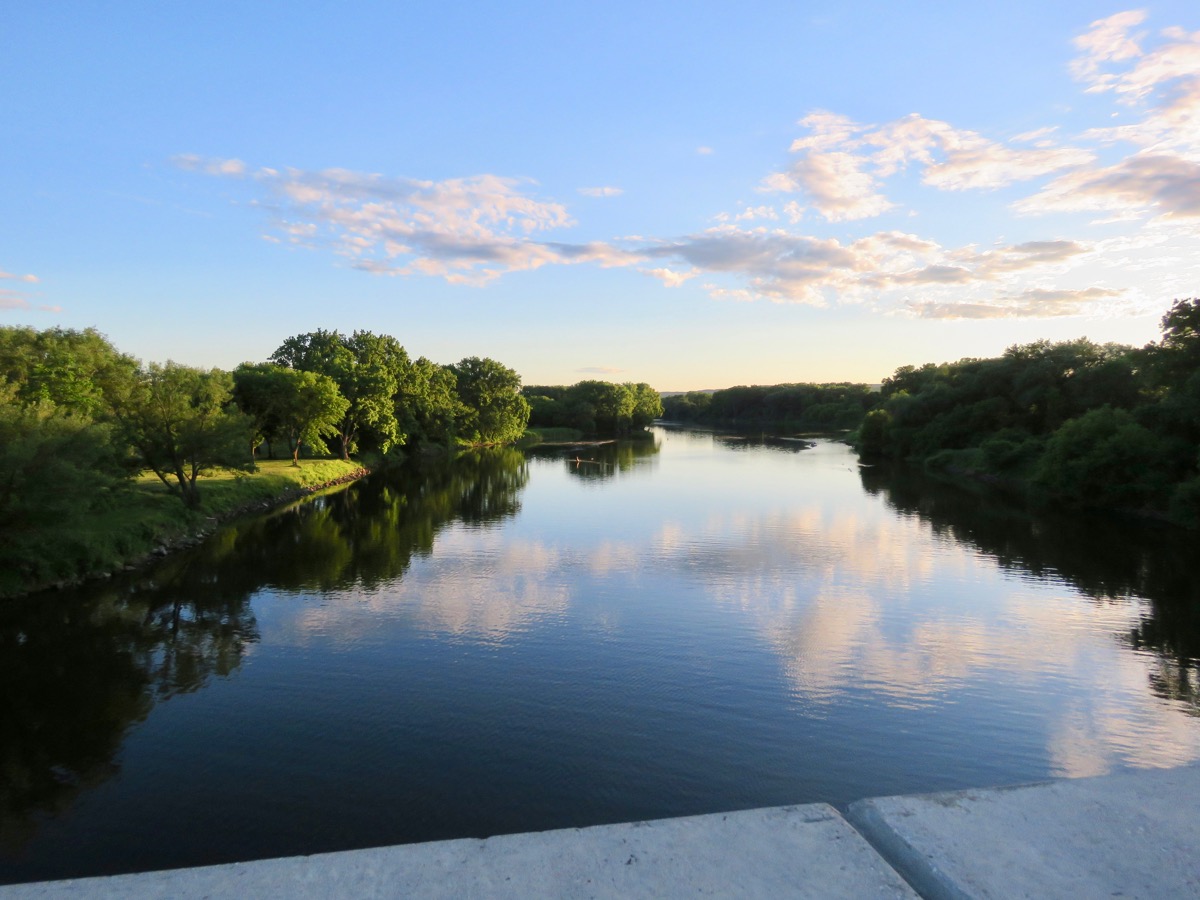 . . [above] the Schenectady side and [below] the Scotia side of Mohawk River channels created by the Isle of the Cayugas, as seen from the sidewalk of the Western Gateway Bridge, on June 15, 2018, near sunset: