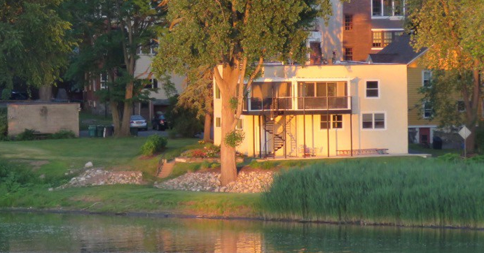 . . above: [top, L] 4 Washington Ave., with retaining wall above bank; [R] 1 Cucumber Alley, with lawn carved along riverbank, and new doorway atop roof (see image below left) . .
