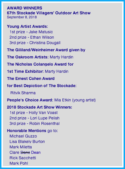 - Many thanks to the Stockade Villagers’ Outdoor Art Show organizers and volunteers. And, warm thanks and smiles for all the artists, neighbors, and visitors who made the event glow, despite the overcast gray sky.