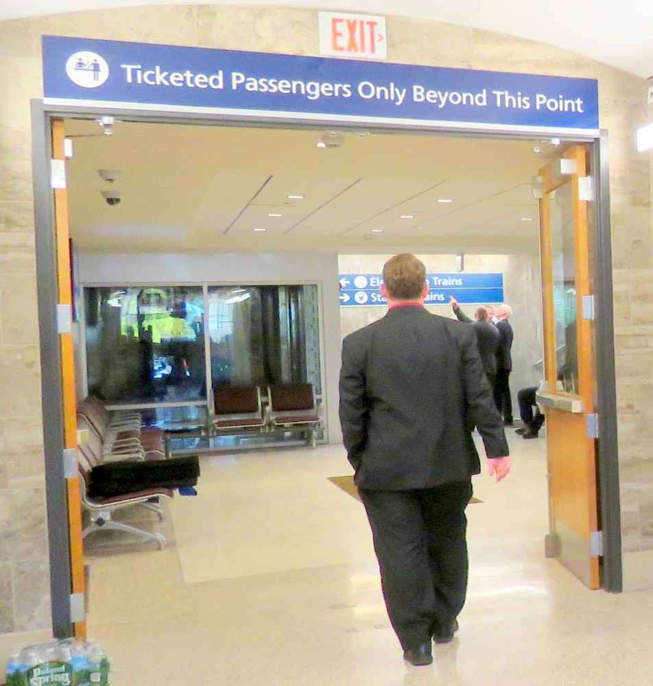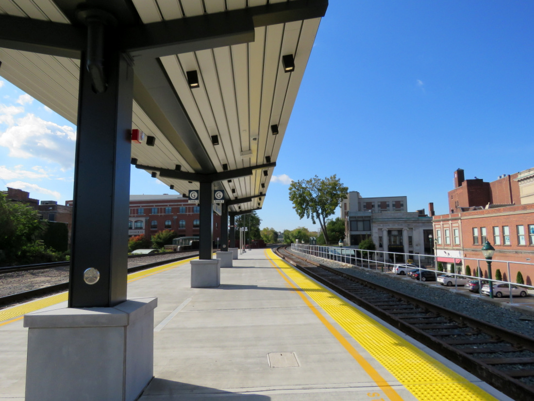follow-up (October 18, 2018): Yesterday, we were asked about seating in the waiting area of the new Station, and stopped in this afternoon to check it out. As expected, the folding chairs set up for yesterday’s opening ceremony were gone, and new seating installed in the public portion of the Station. Similar seating was in-place yesterday in the seating area for ticketed passengers. They seem comfortable, but I did not stay long enough for a true test drive. On the way out, I also snapped a photo of one of the sturdy new planters placed near the entrance of the Station (photo at the head of this blurb).