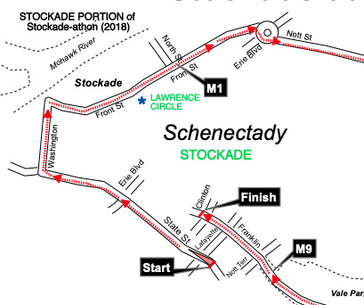 This year’s Stockade-athon race course change is a goodie. Four years ago this week, I wrote a rather grumpy post at this weblog titled “Stockade-athon 2014 abandons Lawrence and trivializes the Stockade” (Nov. 8, 2014), because the course for the road race had been altered, with one change removing the Stockade portion of Front Street from the Stockade-athon. The half-way point of the 15K race had always been Lawrence Circle, with the entourage of runners entering from Nott Street and running west up Front Street past Lawrence to Washington Avenue. The race cohort was stretched out by then, so that the last stalwarts passed by Lawrence about 45-minutes after the front-runners.