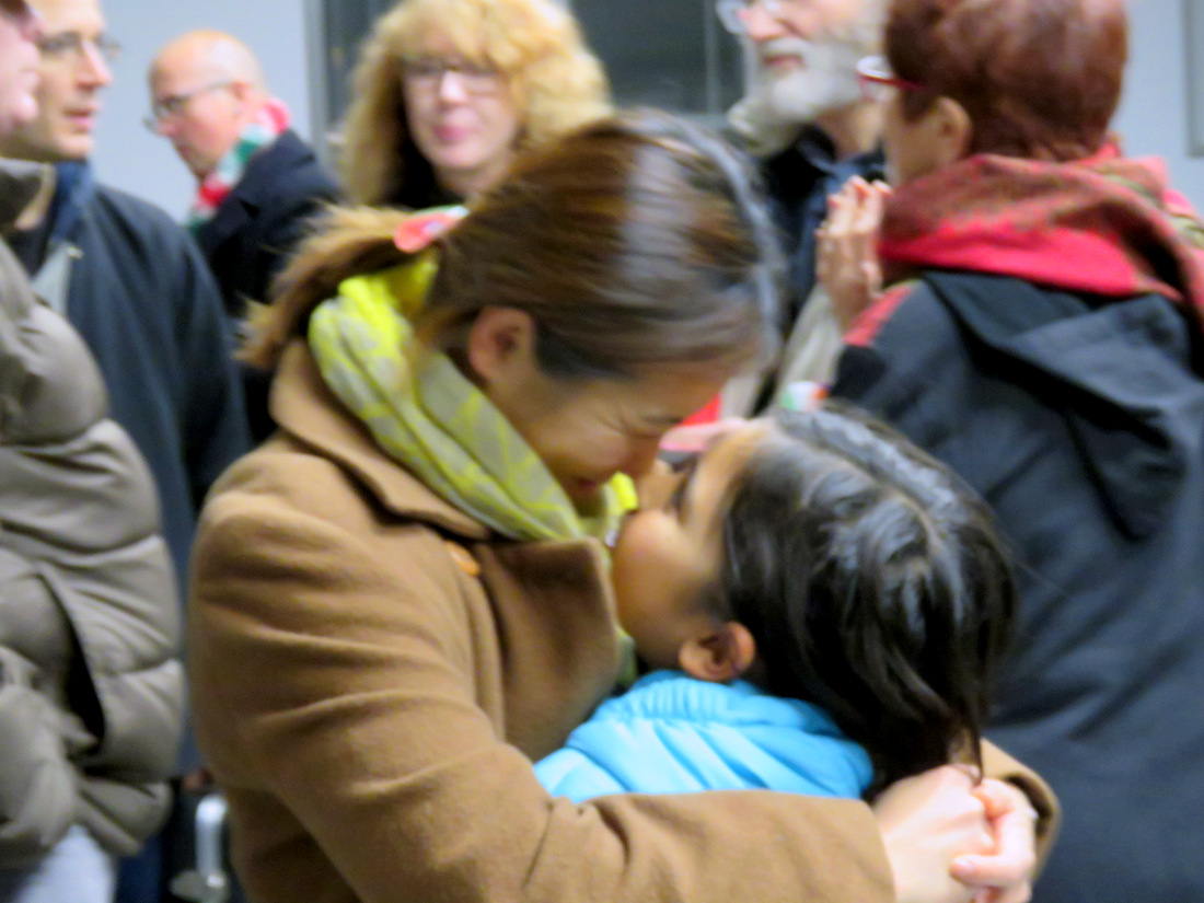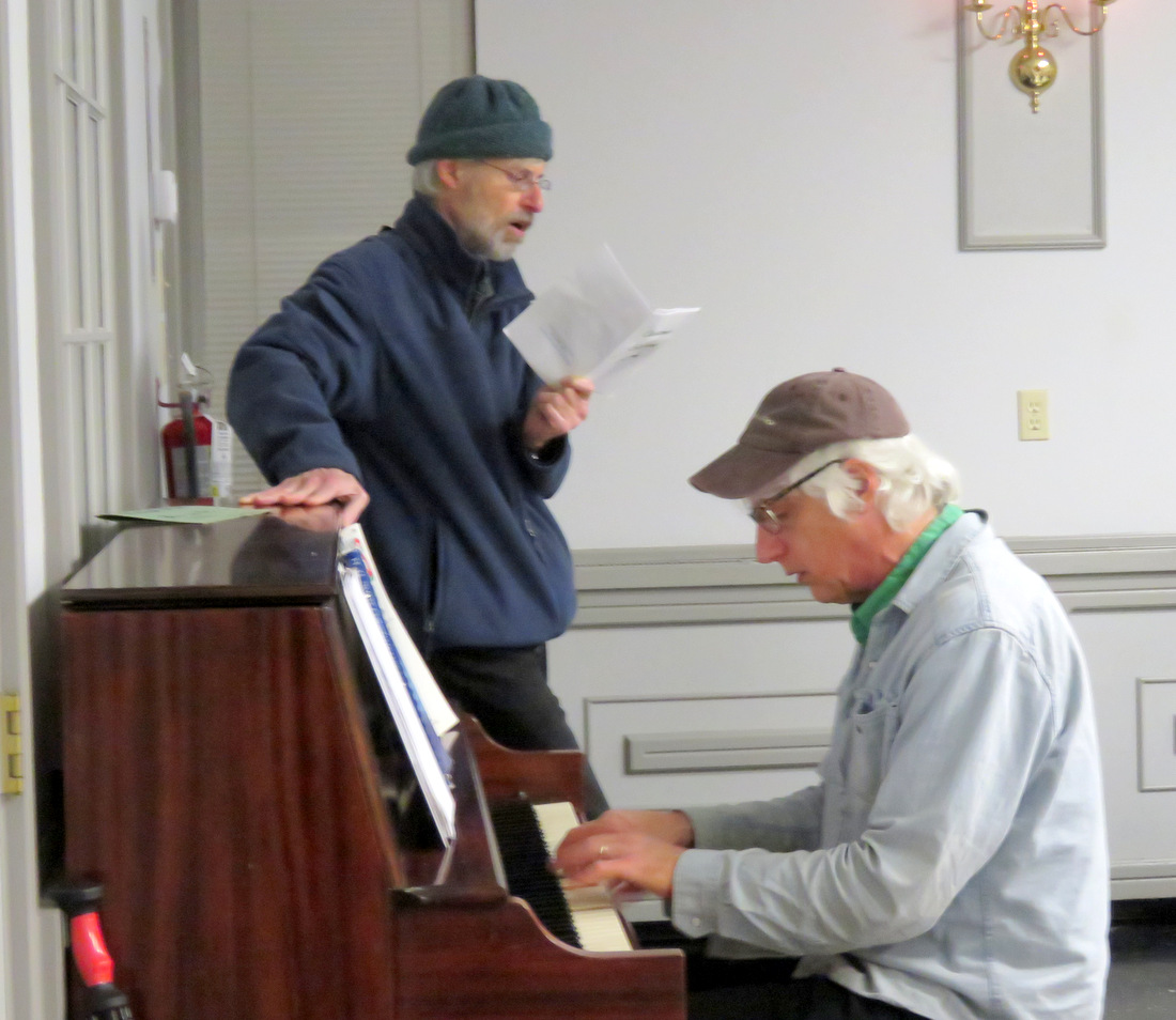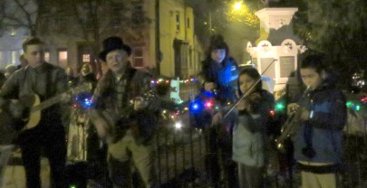 . . above: Bob Lemmerman (with banjo) led the caroling, accompanied by a stalwart guitarist Charlie Schneiderwind, and was joined too briefly by Hainuo [far right] and Concetta