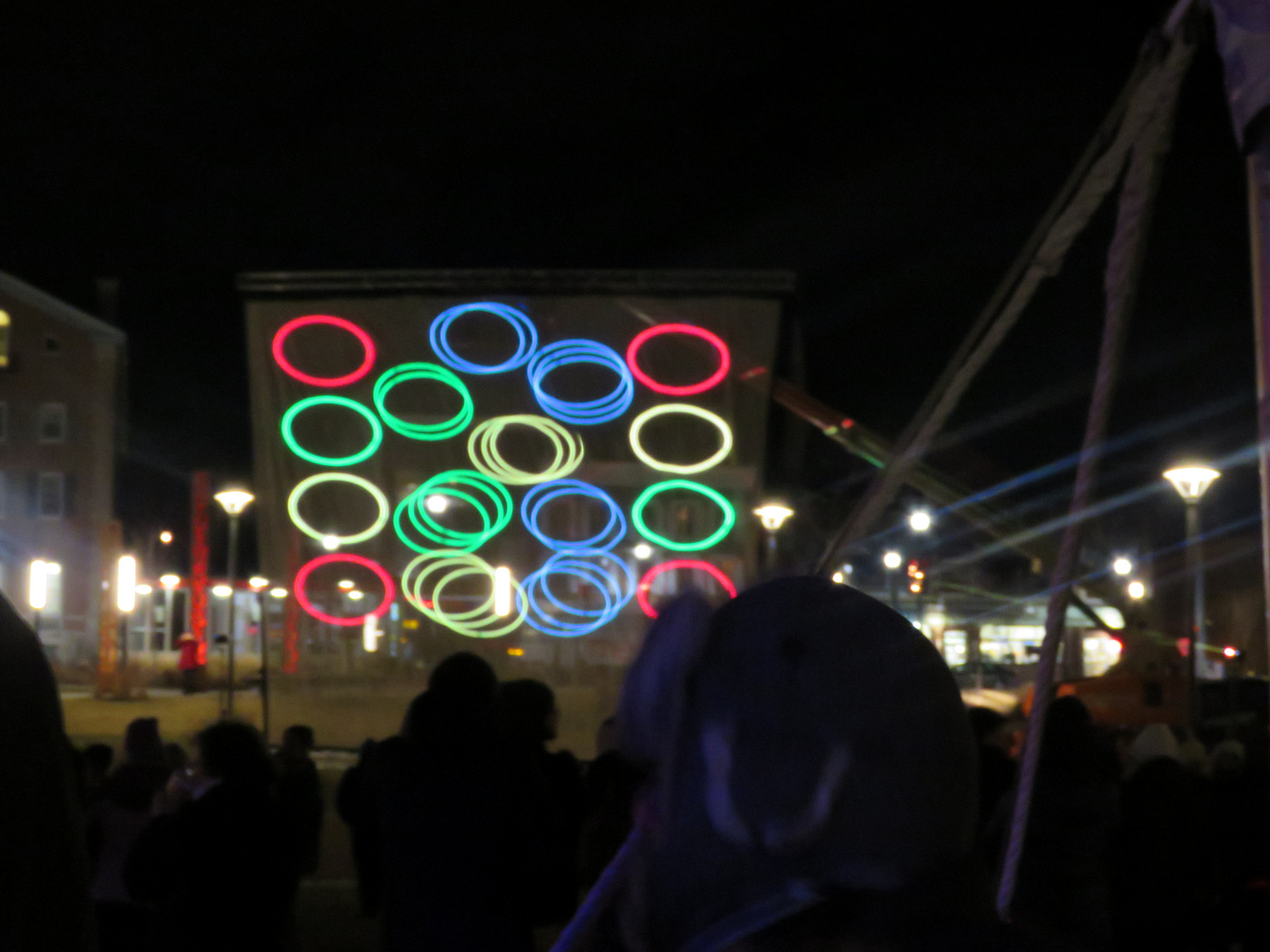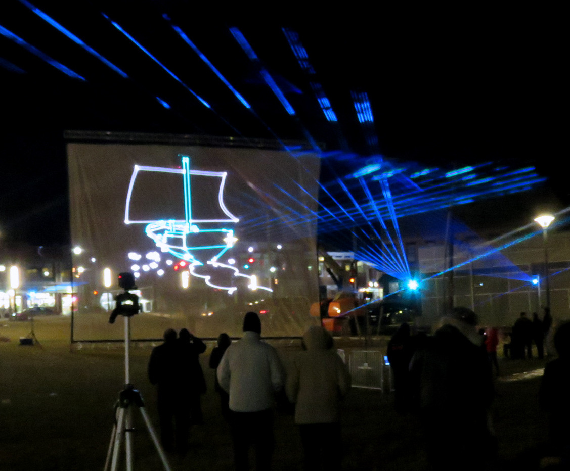 . . Right: Gateway Plaza designer (and Planning Commission Chair) Mary Moore Wallinger at the Nearly Event with her son; Below: Light-show screen viewed from behind the urban pillar art chosen by Ms. Wallinger for the Plaza . .