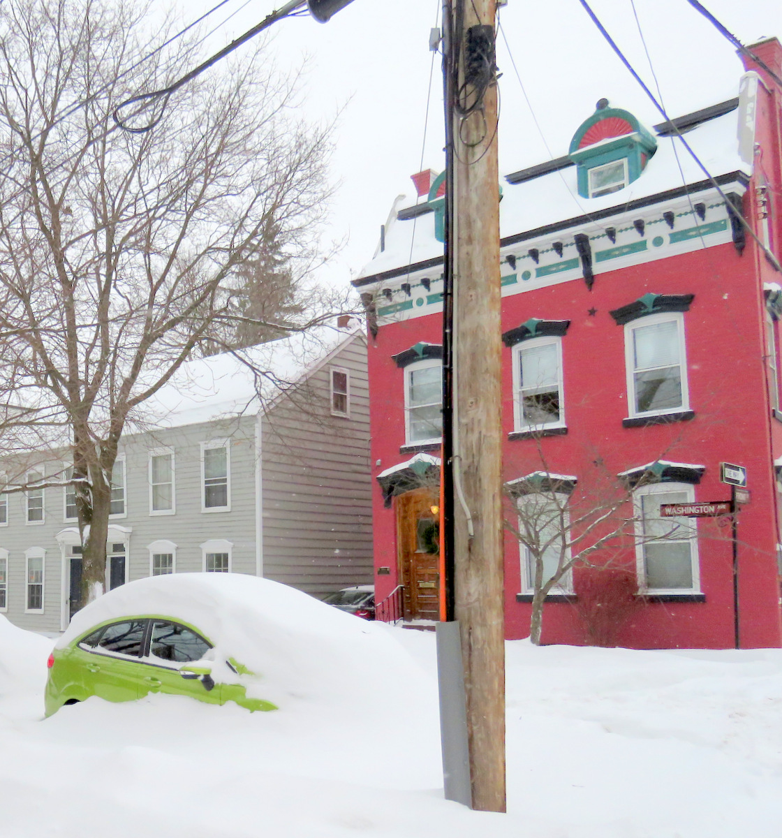 Nonetheless, below are a few pictures presented to memorialize the event. (The image above is out my front door, Washington Avenue at Front Street/Cucumber Alley.) At the end of my Snow Sojourn, a bit of blue appeared in the sky as I approached home, as seen here above the Schenectady County Historical Society.