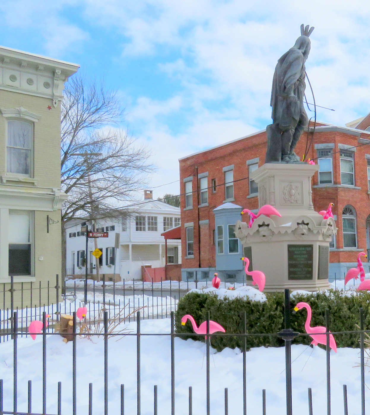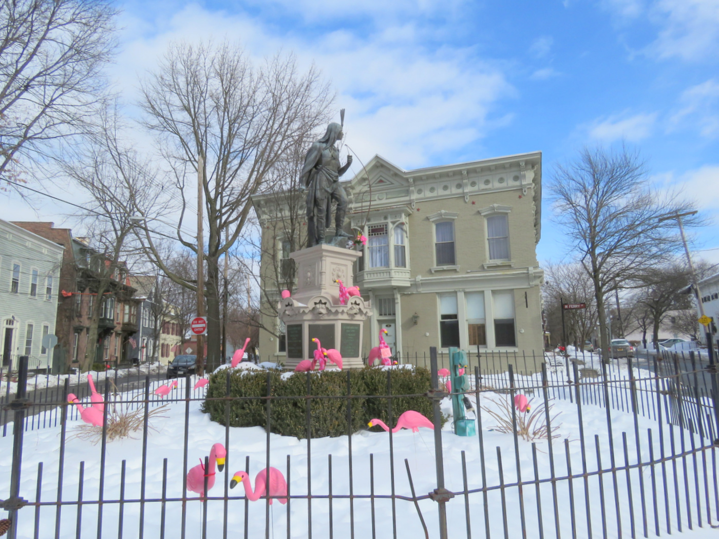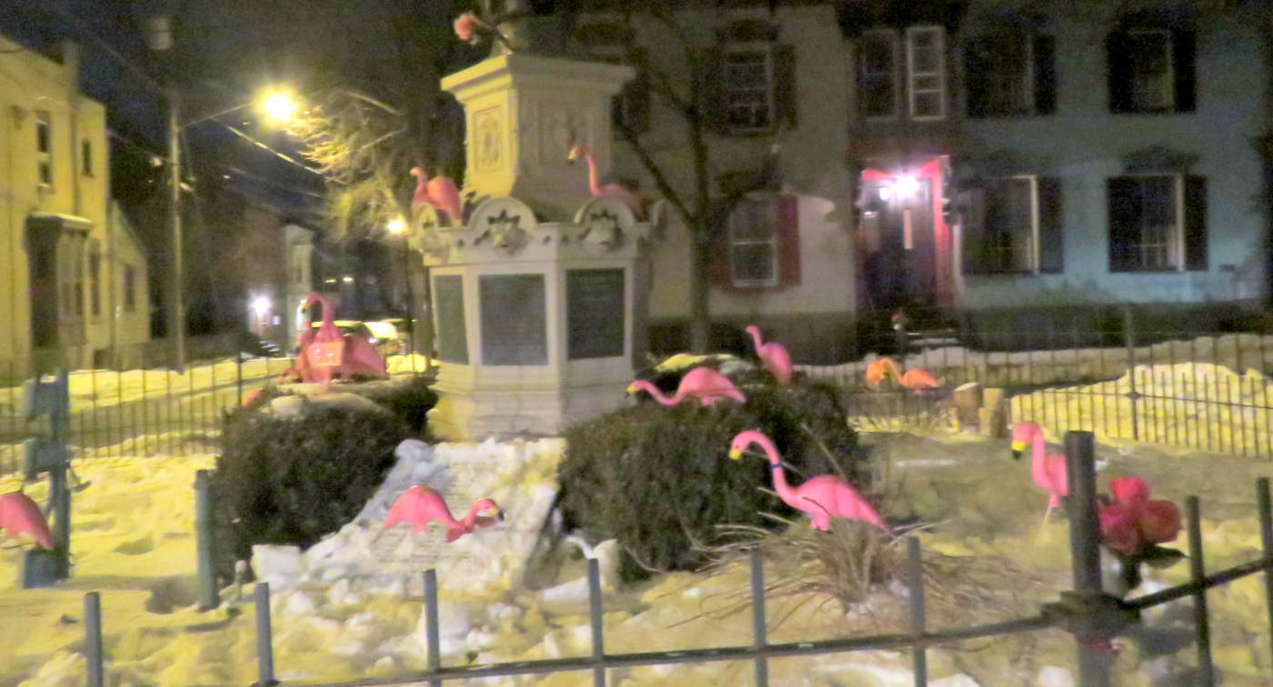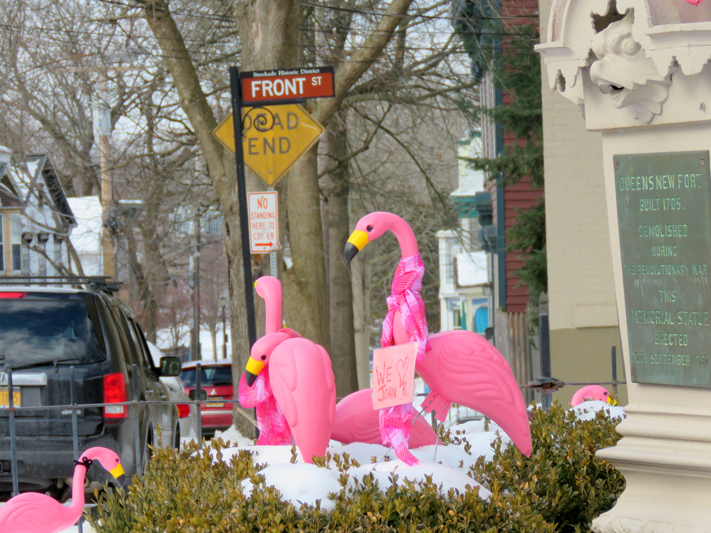 - For a trip into Stockade Flamingo History, see the links on our Valentine Flamingo Category page, or view the 20-page photobook “Valentine Flamingos in the Schenectady Stockade: whimsy and mystery at Lawrence Circle” (3rd Edition, 2016).