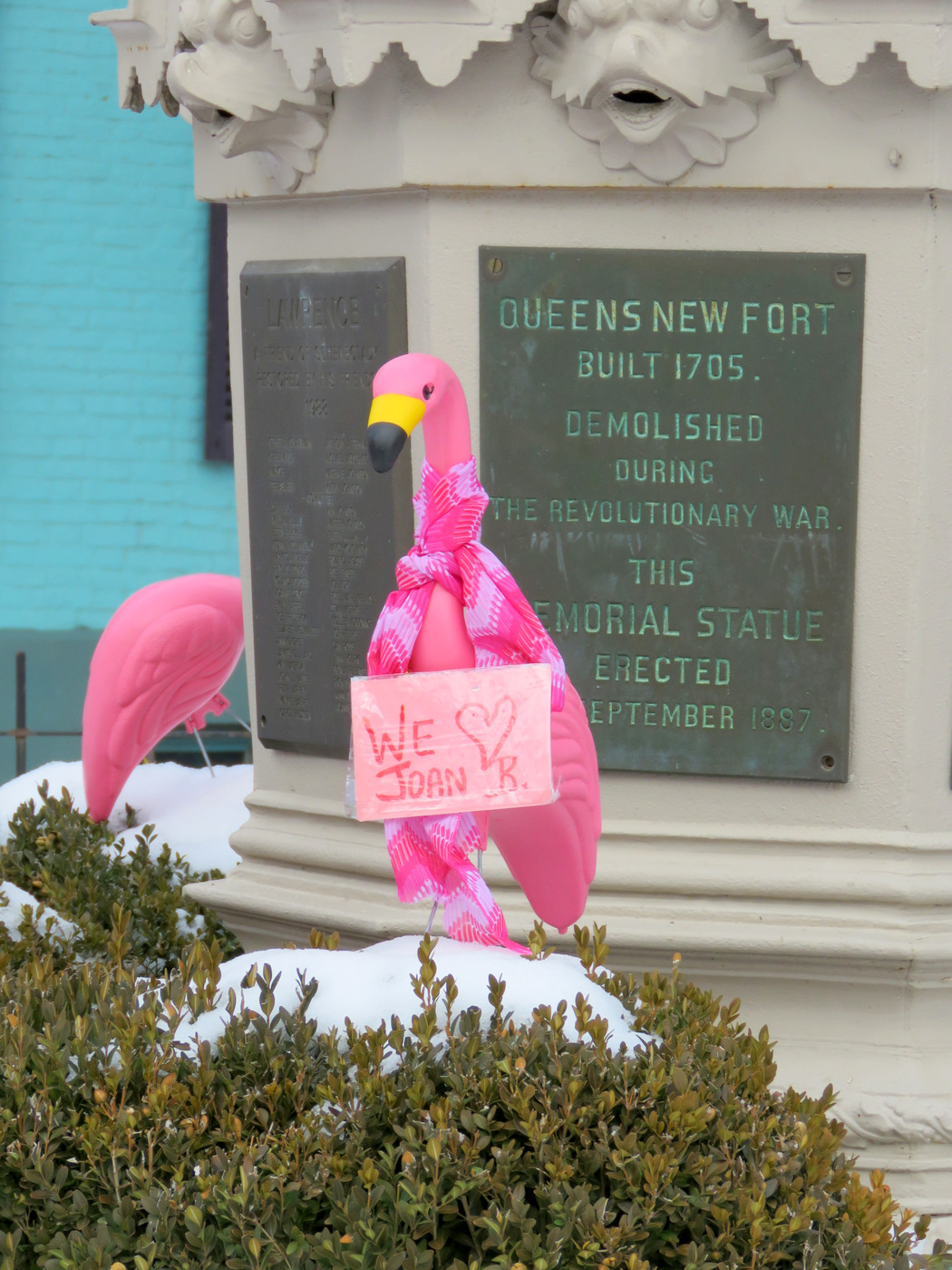 Lovers of the Valentine Flamingo tradition would like to dedicate this year’s Flamboyance at Lawrence Circle to our dearly missed, joyful friend Joan Bessarab, with thanks for all the smiles over the decades.