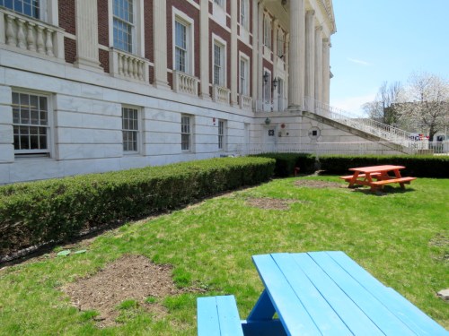 follow-up (August 27, 2019): Walking out of the Schenectady main Post Office yesterday, I glanced across the street at City Hall, and got another perspective on the City’s excuse that the uprooted cherry blossom trees were just too darn close to the building to allow proper work on replacing its windows. Here, without further comment, except to note that the cherry trees were on the lawn-side of those hedges, is the photo I took: