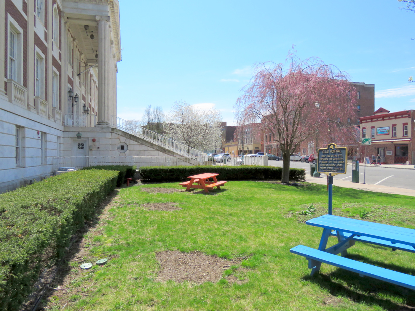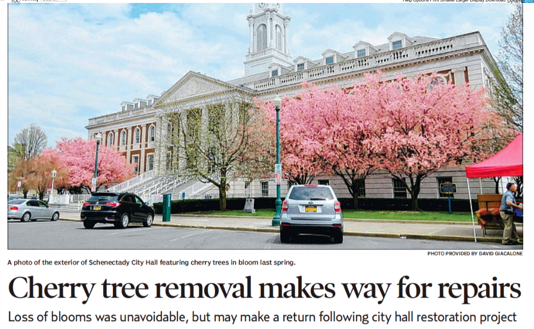 *See “Removal of City Hall cherry trees leads to muted blooms: Trees removed to make way for restoration project” (Daily Gazette, by Pete DeMola, April 29, 2019, at C1), and Update at bottom of this posting.