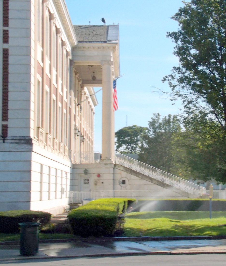 follow-up (August 27, 2019): Walking out of the Schenectady main Post Office yesterday, I glanced across the street at City Hall, and got another perspective on the City’s excuse that the uprooted cherry blossom trees were just too darn close to the building to allow proper work on replacing its windows. Here, without further comment, except to note that the cherry trees were on the lawn-side of those hedges, is the photo I took: