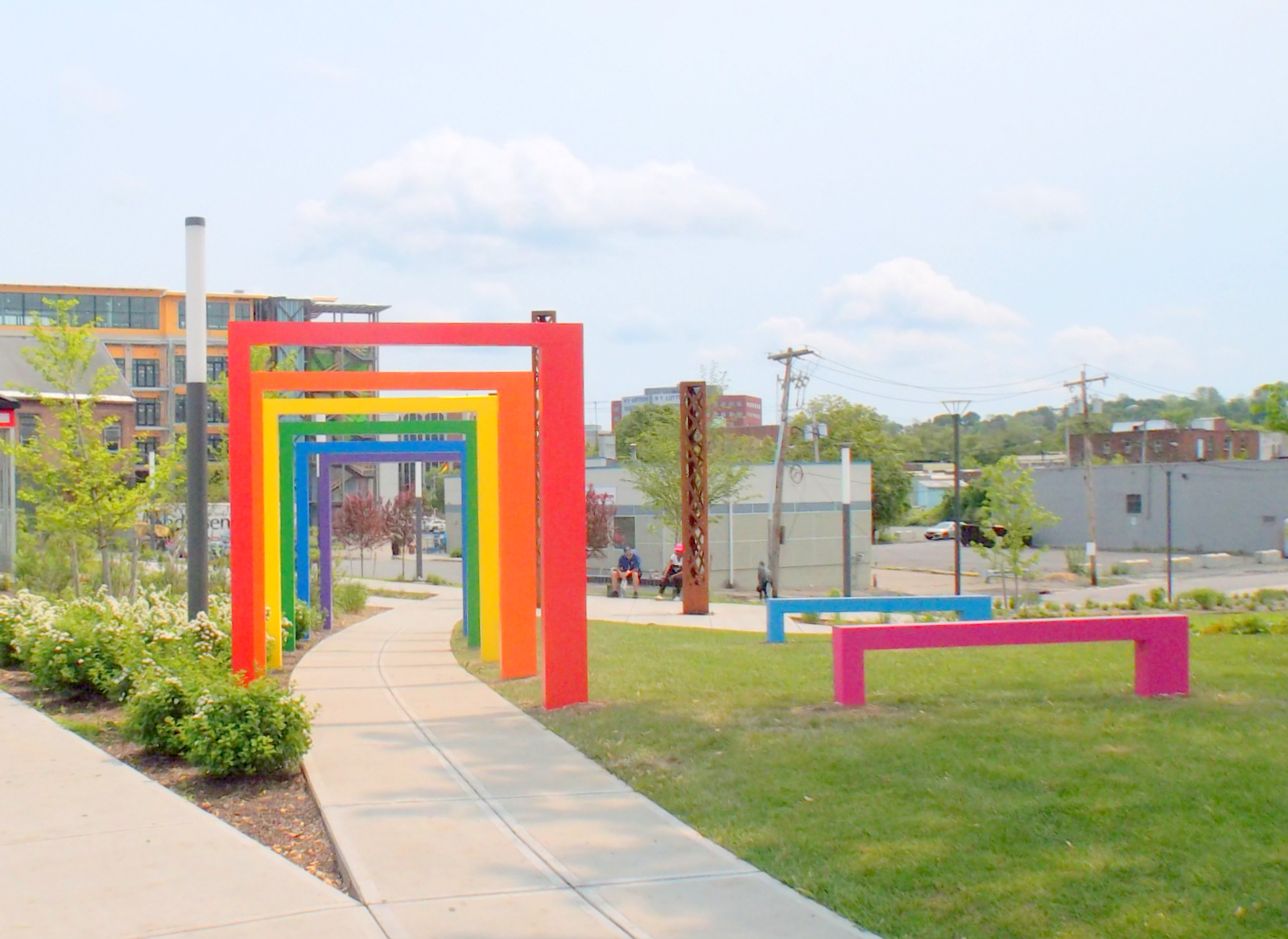 Frankly, despite the merits of the cause, my first impression from the photo in the Gazette balked at this “vandalism” to a visually complete piece of public art-sculpture. But, I trotted down to Gateway-Liberty Park to see it for myself. The changes seemed less brash under a gray sky, Nonetheless, I still think a new, separate arch or a separate pedestal of some sort strategically close-by, might have been artistically more appropriate — with something temporary now, in the rush of the BLM wave and the Rainbow Pride Festival.