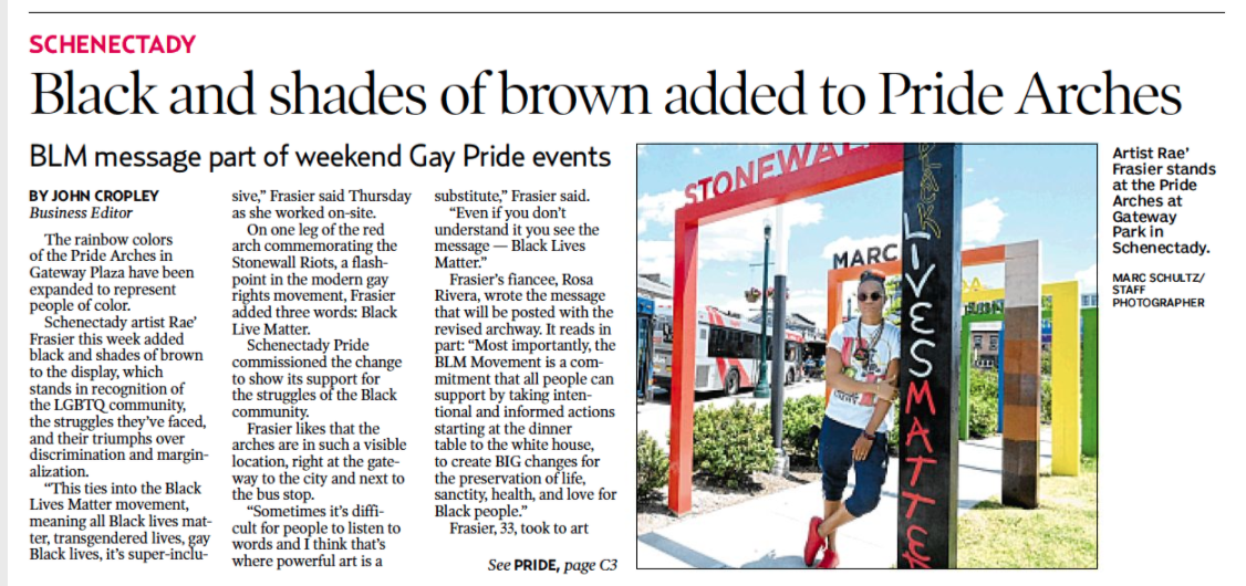 “Schenectady artist Rae’ Frasier this week added black and shades of brown to the display, which stands in recognition of the LGBTQ community, the struggles they’ve faced, and their triumphs over discrimination and marginalization.”