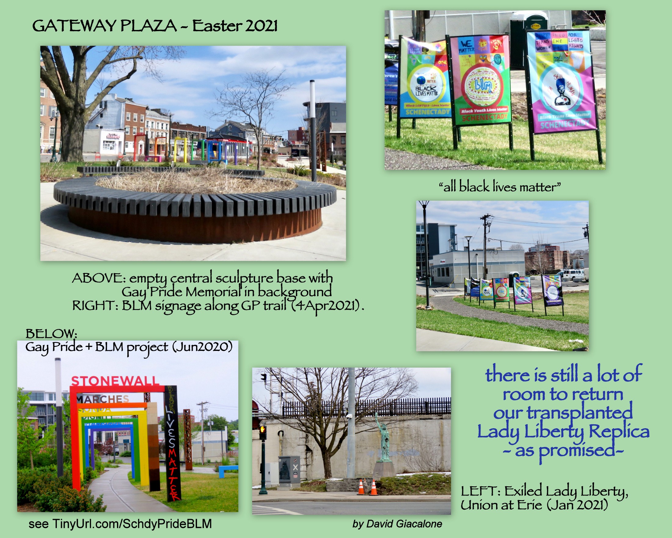 follow-up (April 5, 2021): A visit to Gateway Plaza yesterday, Easter Sunday, found a continued absence of Lady Liberty in the Plaza/Park, especially on the central sculpture base, but additional Black Lives Matter signage along a Plaza Trail.