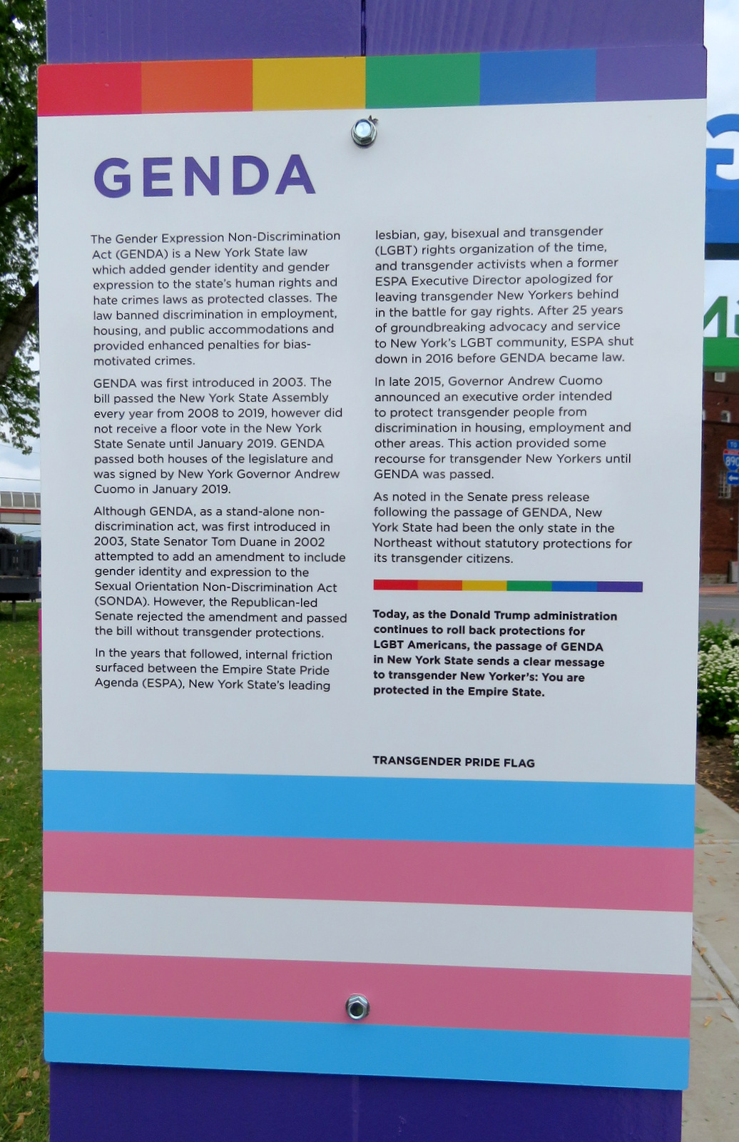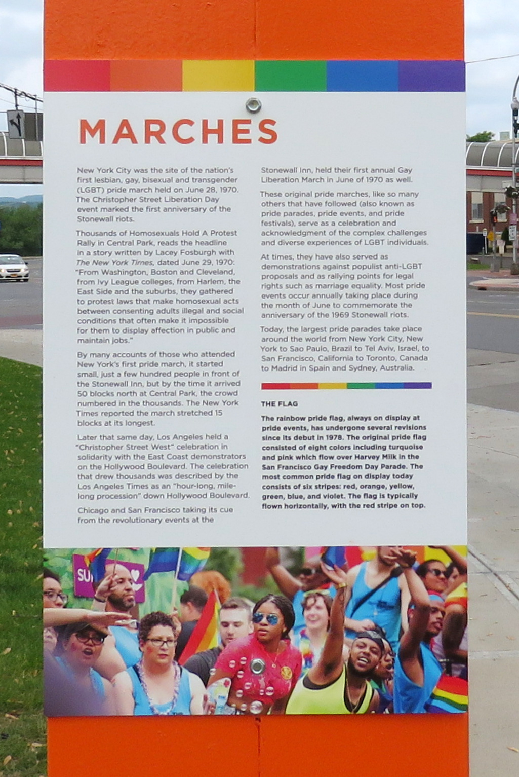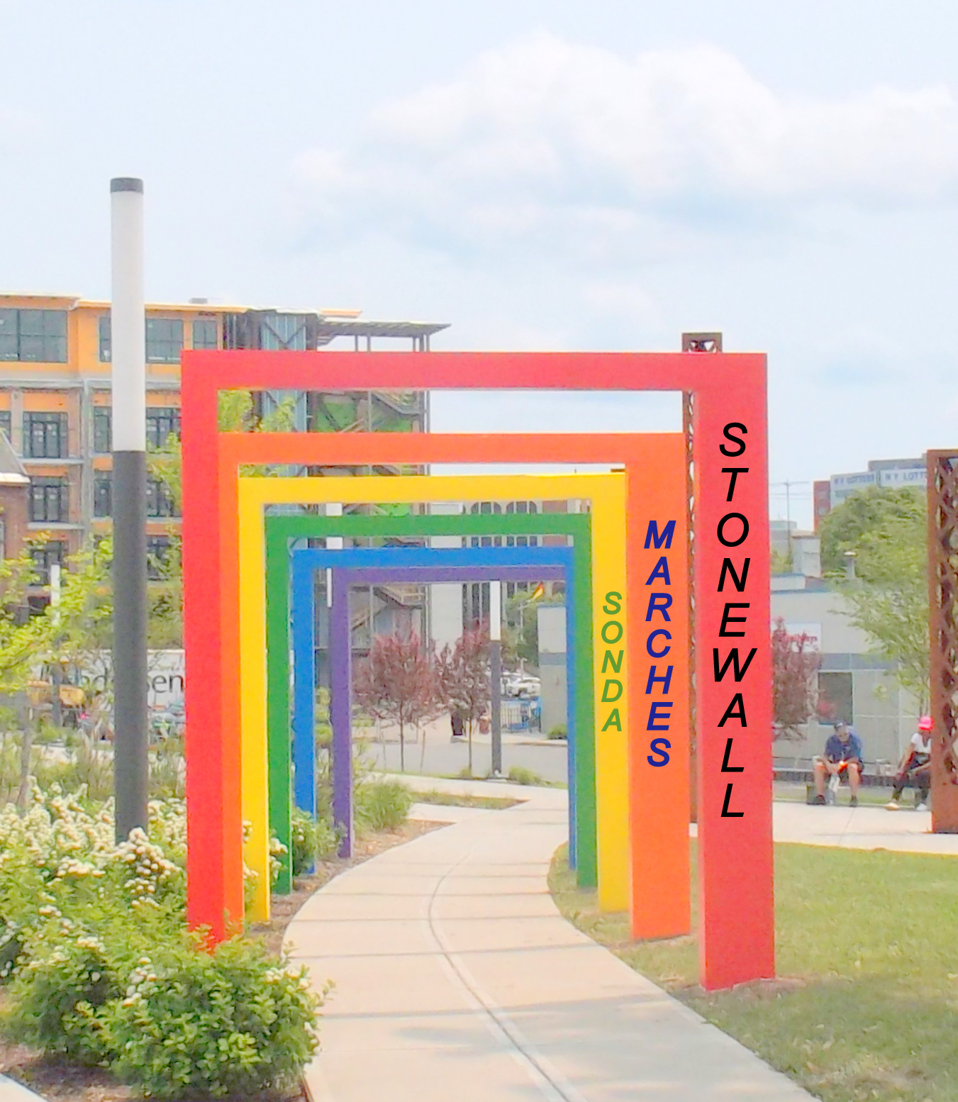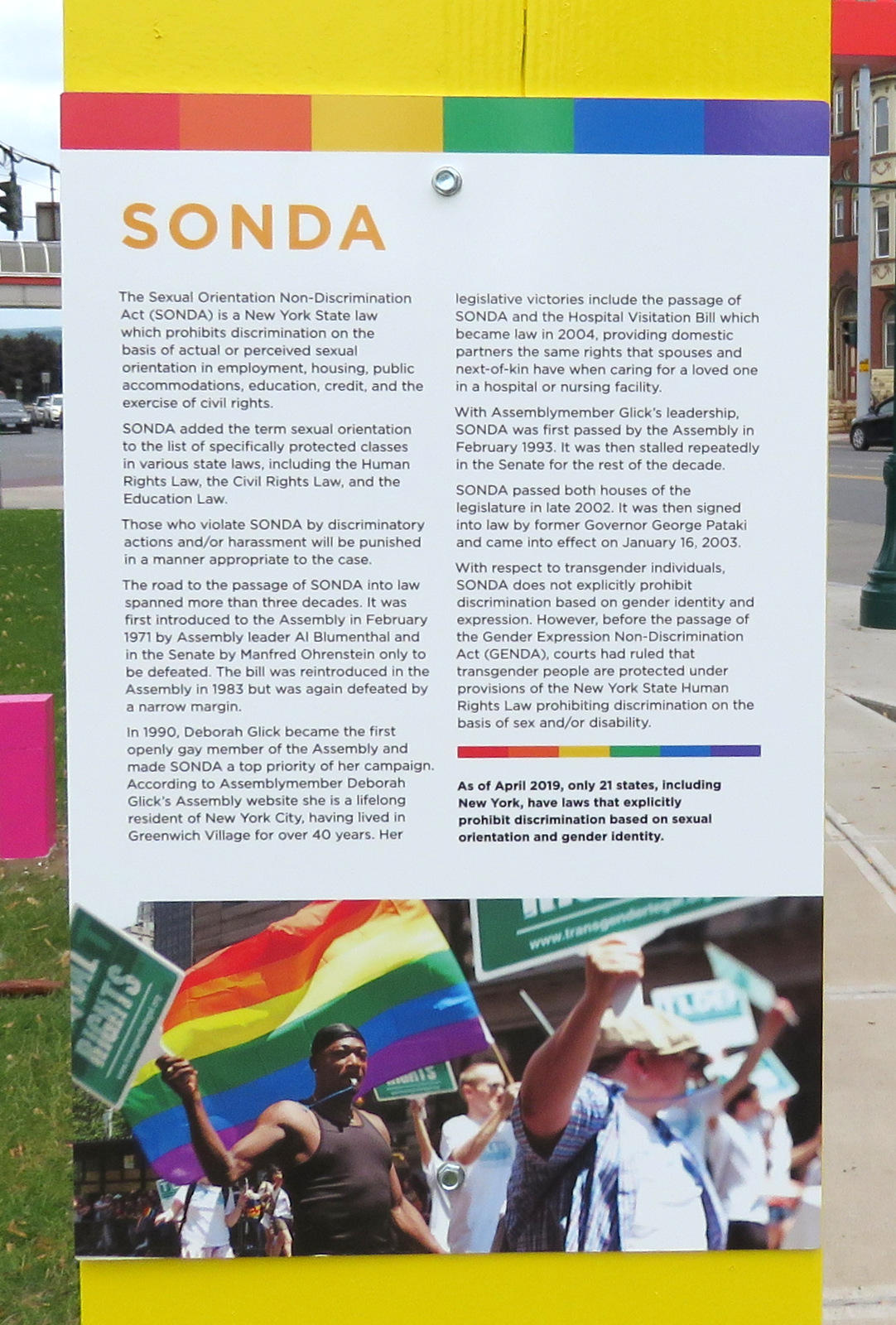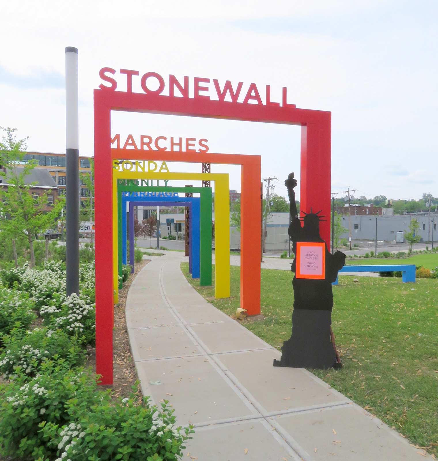 Below are a handful of additional photos of the Rainbow Pride Art Project taken several hours before the exhibit would be “revealed” and dedication this afternoon (June 2, 2019). Each arch has a Milestone title in wooden letters on its crossbeam, as well as a placard that describes the Milestone and its history. Two of the Milestones are stated as acronyms for legislation protecting LGBT rights. Scroll down this post to find thumbnail images of each placard; click on the image for a larger, readable version. After the placards, I’ve included several images of Silhouette Lady, who feels very much at home at the Pride installation, and hopes Schenectady Pride will reciprocate and help Lady Liberty back to her Liberty Park home.