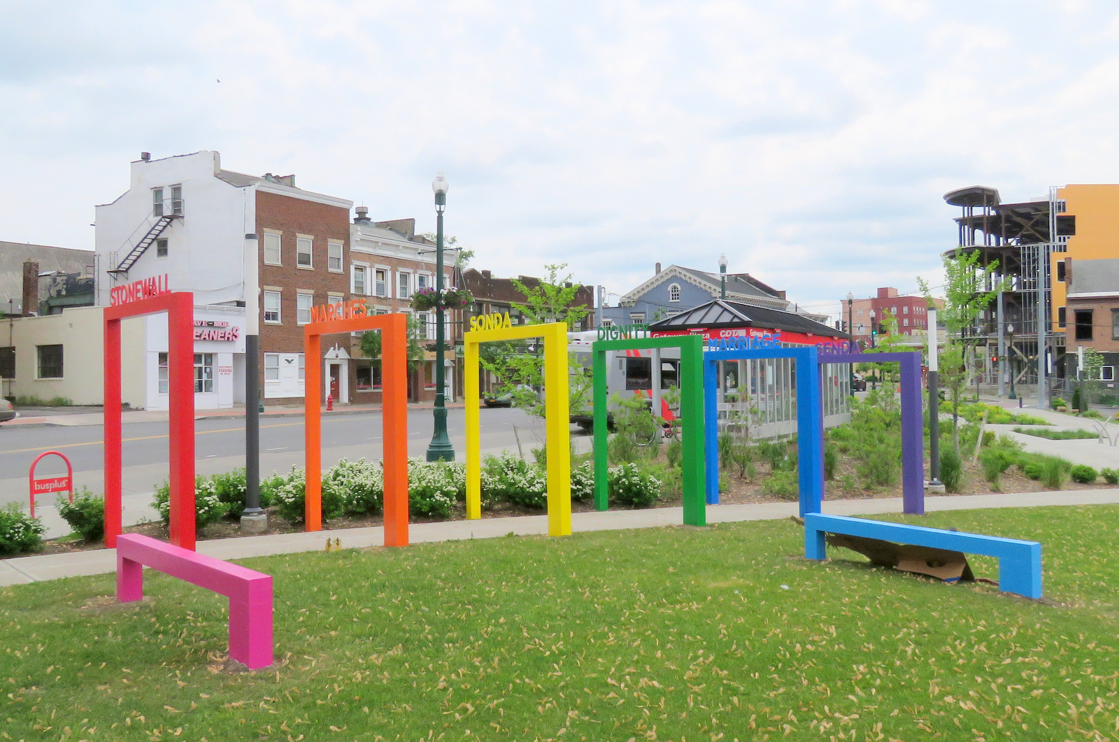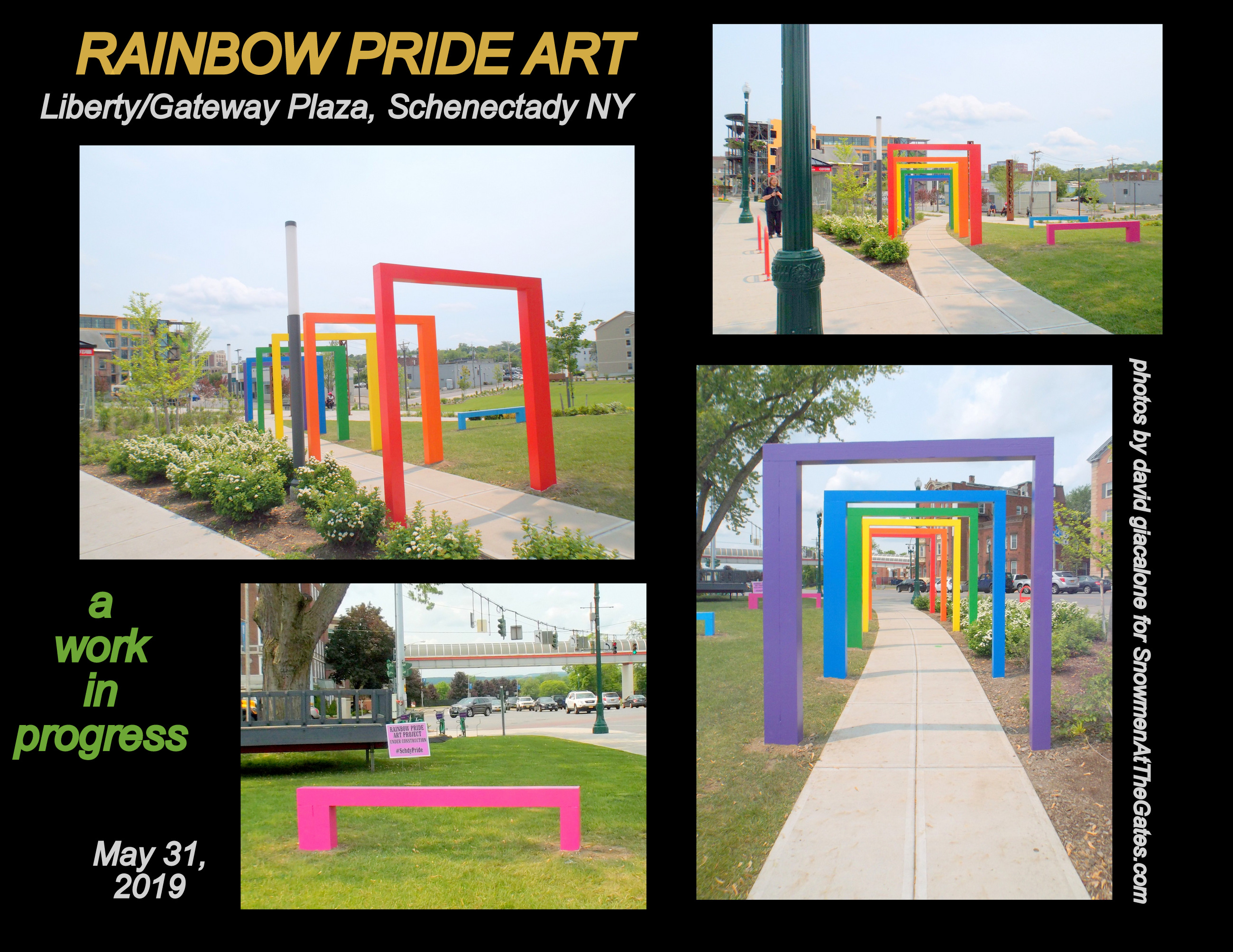 I‘ve been curious to see how the Schenectady Pride Art Project at Gateway-Liberty Plaza would turn out, ever since I first learned about it last November. (spoiler alert: I like it a lot more than I had anticipated). At the time, frankly, I was concerned that “rushing it through with no chance for meaningful public input on its basic design, size, materials, or location within the Plaza, undermines the public consensus for celebrating the important civil rights victories.” And, I opined that “Schenectady PRIDE and the 50th Anniversary of the Stonewall Uprising deserve a much better design.”