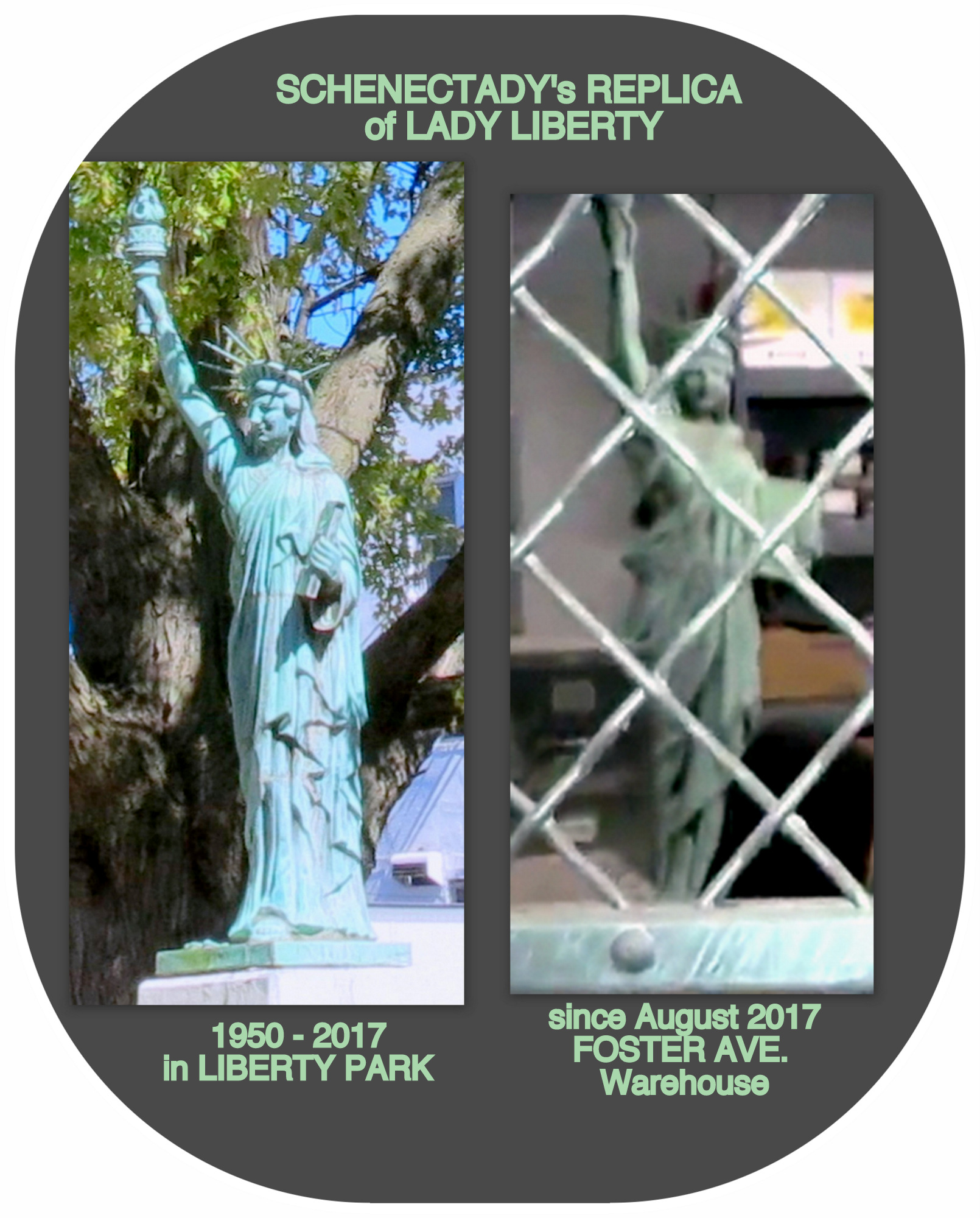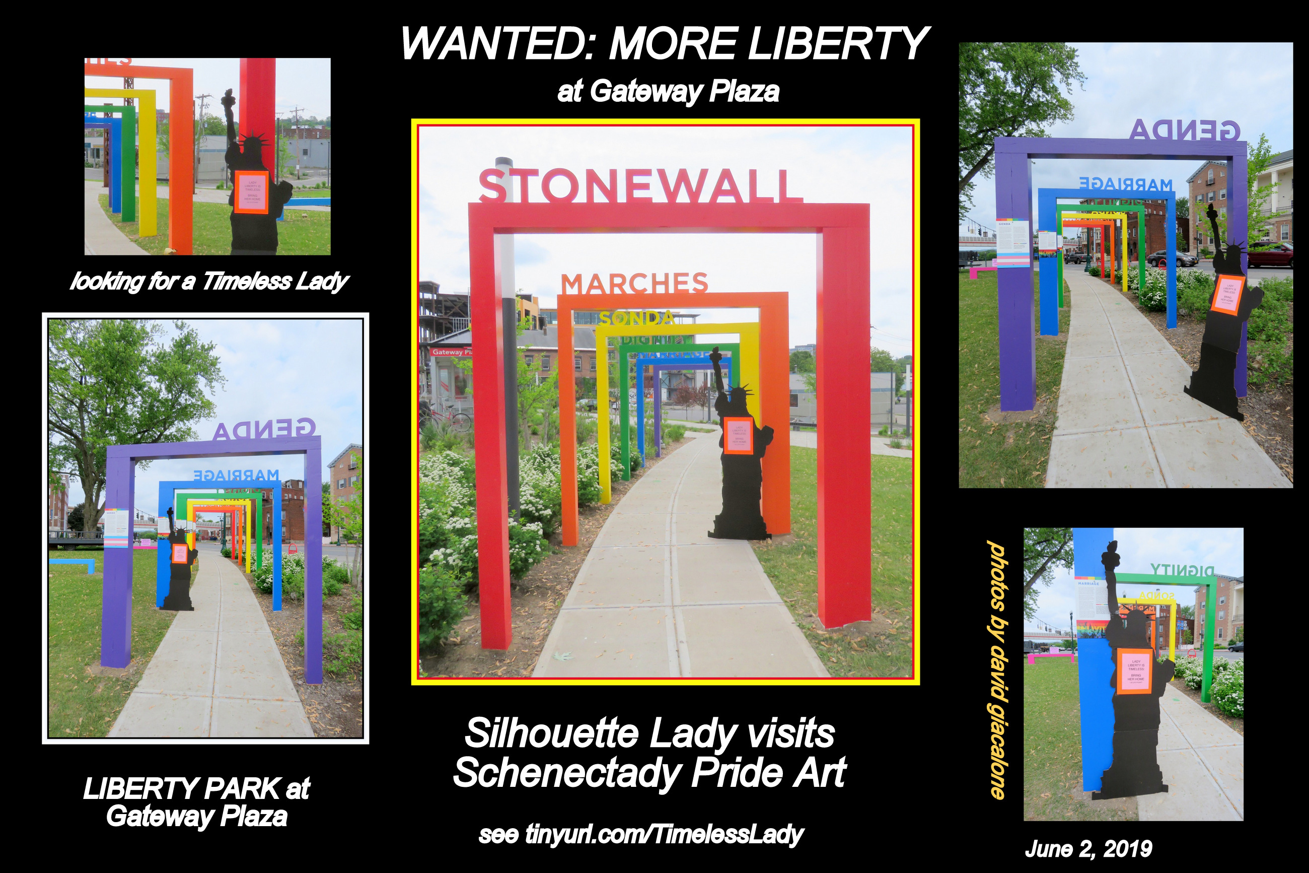 In her Implementation Plan for Gateway Plaza, designer Mary Wallinger stated that the Plaza was meant to “celebrate our past, present, and future.” There is no single symbol in Schenectady that fills that role better than our Replica Statue of Liberty. Nonetheless Lady Liberty has been “exiled” by Mayor McCarthy and Ms. Wallinger for failing to be “contemporary” enough. Silhouette Lady disagrees strongly, and made the point this morning while visiting the Schenectady Rainbow Pride Art installation. As you can see in this collage: