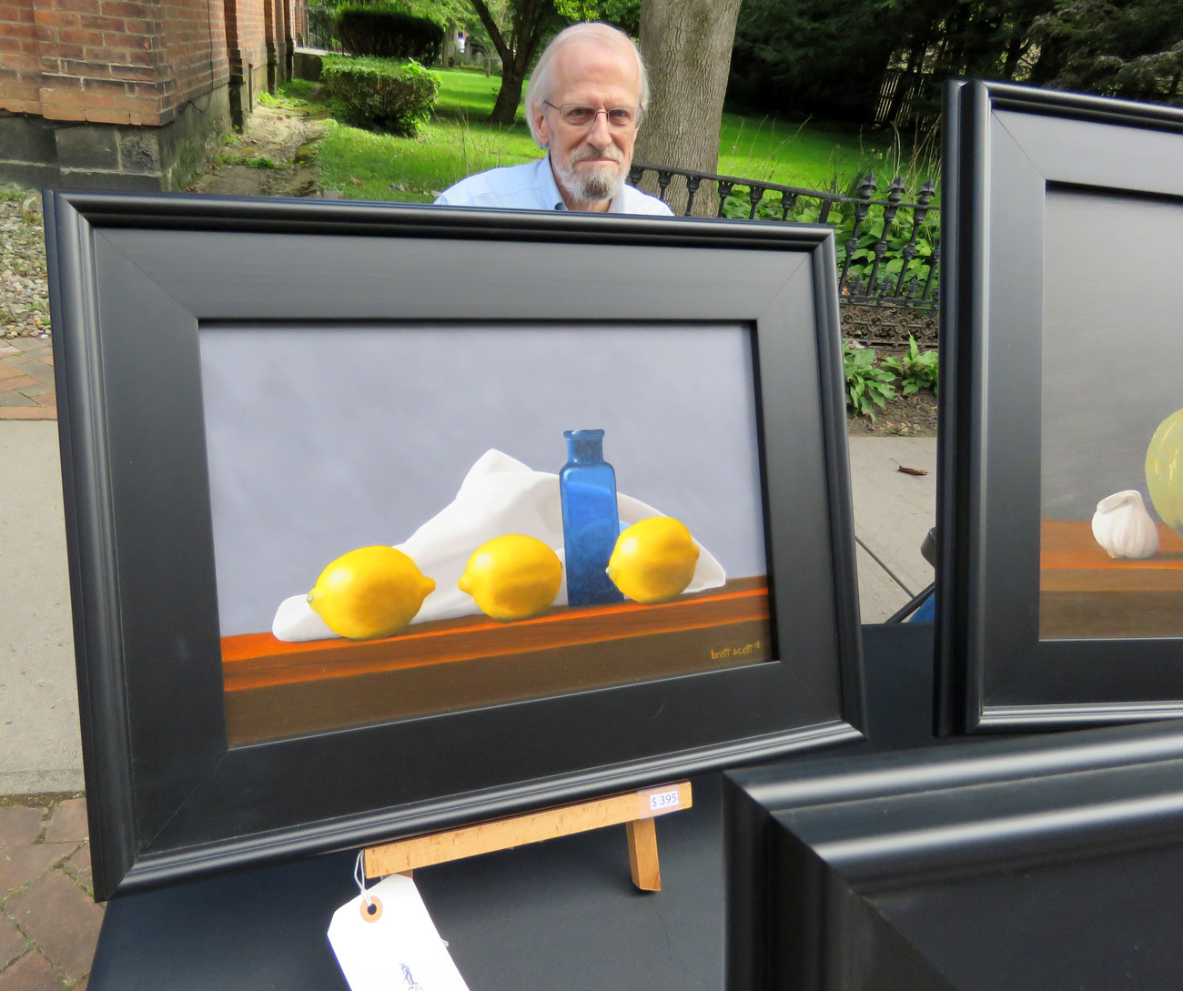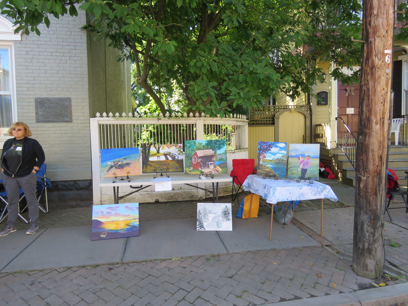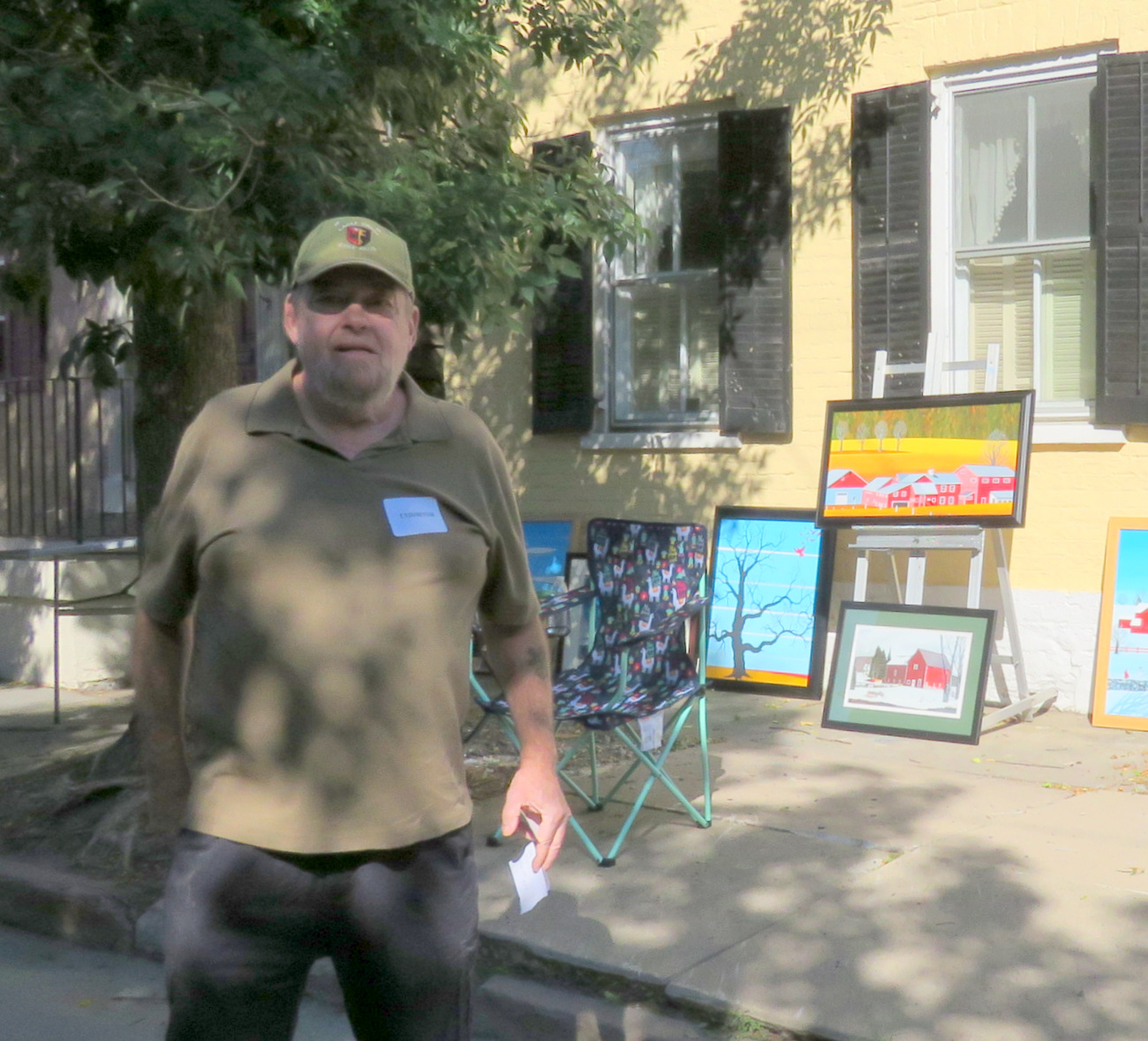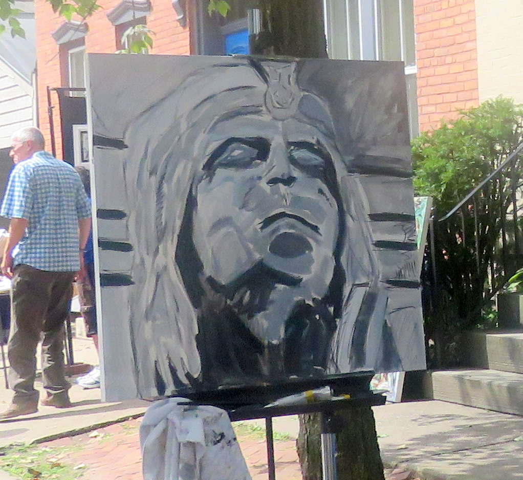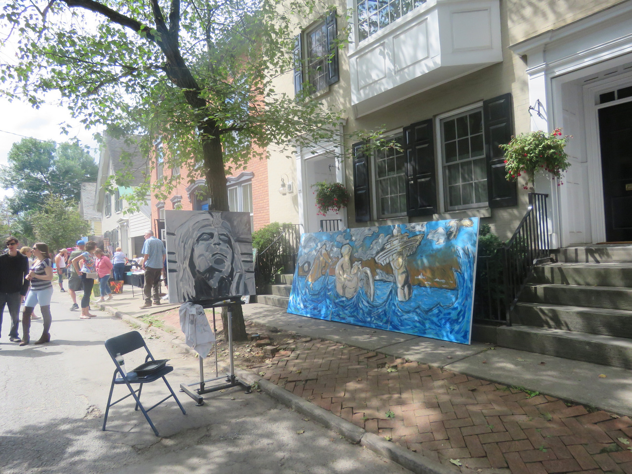 My expectations are always high as I head out the door for the annual outdoor art show on the blocks surrounding Lawrence Circle in Schenectady’s Stockade. With comfortable temperatures, art by new and returning artists displayed under sunny blue skies, and exhibitors, neighbors and visitors in good spirits, the 68th Annual Stockade Villagers’ Outdoor Art Show did not disappoint. During over five hours of shooting and schmoozing, I totally enjoyed myself and the 2019 Outdoor Art Show, from my first photo [above, R, entering at N. Church and Front Streets, about 9:40 AM] to the last [below, a portrait of Lawrence painted during the Show by Erik Rutnik].